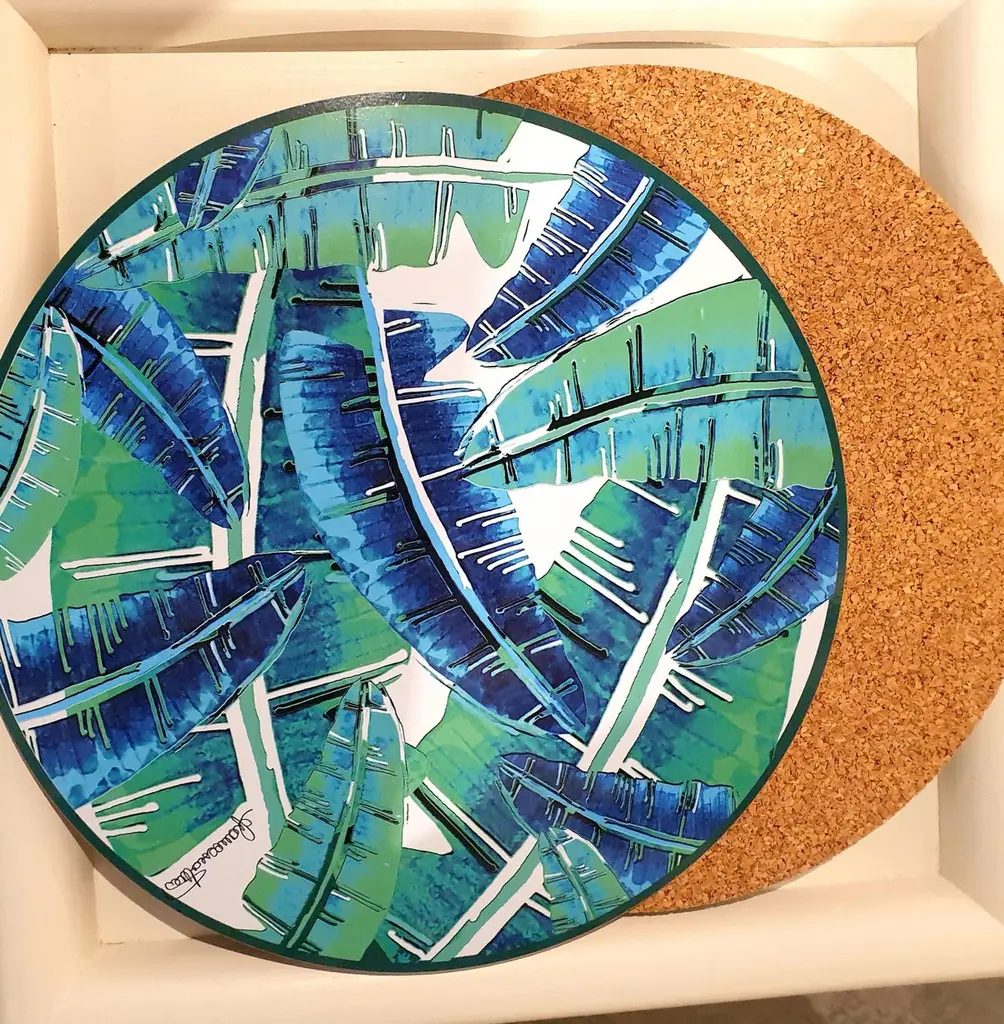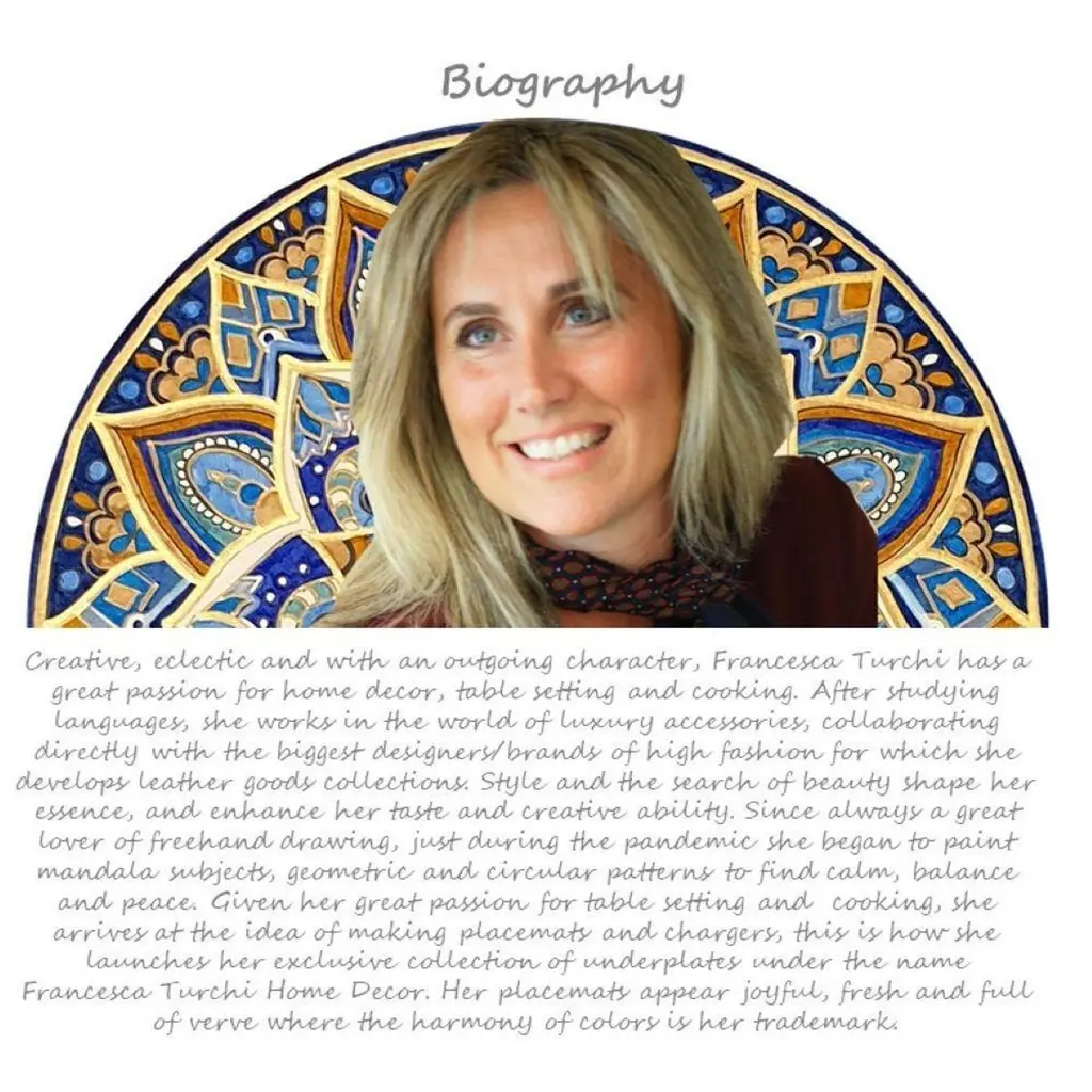 This series of elegant and super stylish underplates are the result of the collaboration of Artecornici Design together with the designer Francesca Turchi.There are many graphics designs, shapes and colors available, as you can see in our Storefront.It is possible on request to mix colors and graphics.The graphic composition, entirely hand-drawn, is printed on the base. The underplate has a very shiny finish, bright, the colors are so highlighted to the maximum optimizing the graphic rendering that reproduces exactly the original design. This finish also has a very high resistance to heat, making the plate useful as a trivet.It is a highly crafted product made from a panel of wood fiber with cork base. The product is strictly natural and 100% made in Italy. Being designs expressly made for these shapes/measures, every design is centered on the underplate making each manual step and each underplate unique in its realization. Easily cleaned with a damp cloth, for decorative use, although very resistant it is not recommended to cut food.The 4mm thick underplates are doubled with a thin layer of cork previously treated to be more resistant and insulating. This layer is always applied with a strictly manual processing that allows grip on the surfaces resulting pleasant to the touch. The customization with logo is centered and clearly visible.It 's a very versatile material and widely used in various fields, but absolutely innovative for its use as placemats that I personally introduced on the market, along with the double-sided printing (with my logo) to create a product completely "double-face", application of which I'm getting the patent.It is a panel composed of 2 very thin aluminum foils that enclose a core of polyethylene. The material is: lightweight, durable, stable, smooth, versatile but above all totally RECYCLABLE! For decorative use, easily washed with a damp cloth, heat resistant and self-extinguishing.Particularly suitable for printing, which exalts and faithfully reproduces the smallest details. The protective coating is semi-glossy and "material", protecting the print but at the same time emphasizing the lines of the design that are perceived by the touch, enhancing its craftsmanship.Moreover, its great versatility in processing allows to produce different shaped forms that follow the lines of the design, also reproducing their irregularity, considered a "uniqueness" that makes the product exclusive and not mass-produced!With over 40 years of experience, Artecornici Design creates high quality frames and handcrafted products to decorate yours using precious woods and working with various types of finishes, offering a vast choice of models.