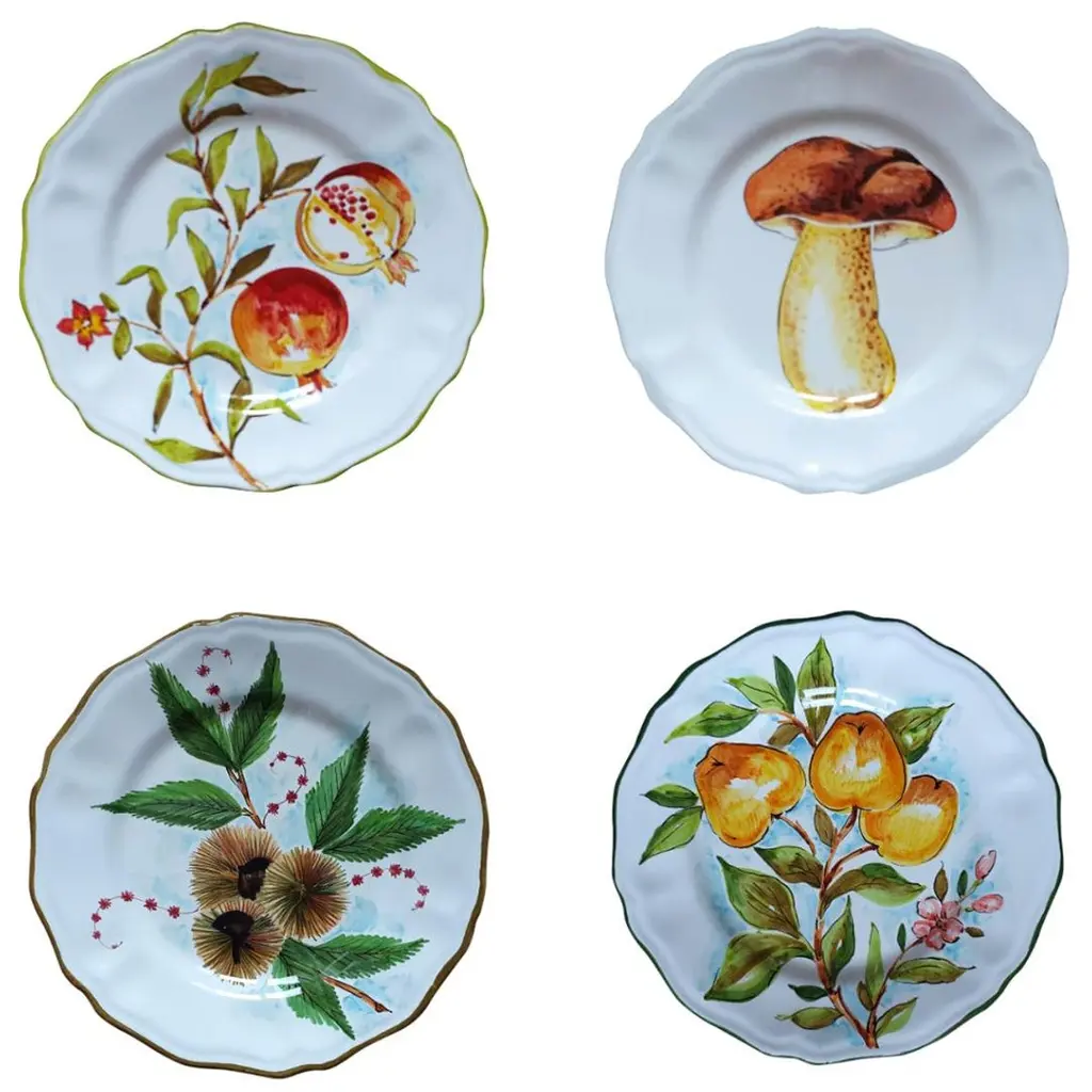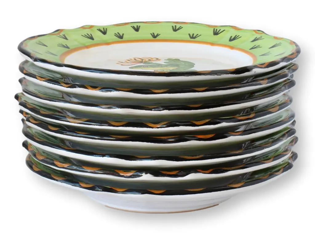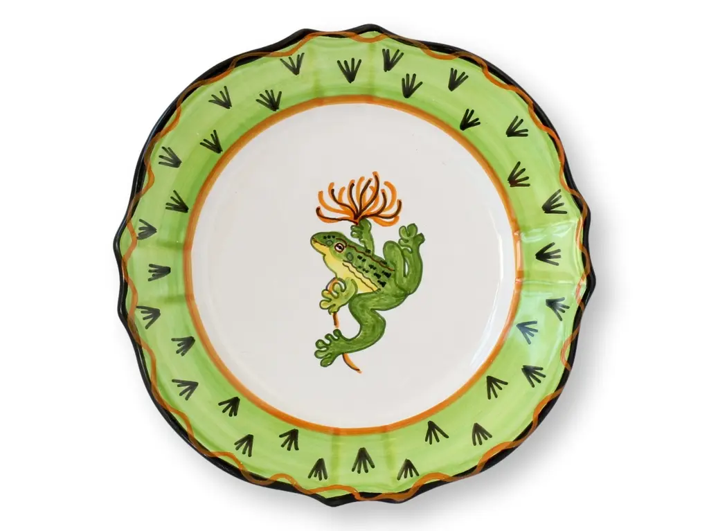 Set of 8 Italian Deruta ceramic plates featuring whimsical frog motifs, perfect for adding charm to your tabletop. Hand-painted in vibrant green with scalloped edges, each plate showcases a lively frog design, embodying the playful artistry Deruta is known for. Ideal for entertaining or displaying as decorative pieces, these plates bring a touch of Italian craftsmanship and joy to any setting. Perfect for collectors or those who appreciate unique, artisan-made dinnerware.