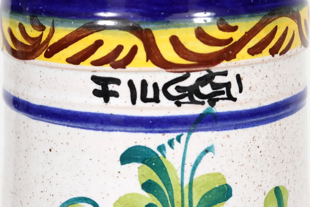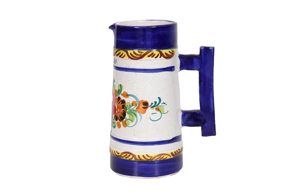An Italian ceramic pitcher. Hand painted with a colorful floral spray on a white background, framed in rich cobalt blue. In the front it’s signed ����Fiuggi”, an Italian province. In the back is a squared handle.