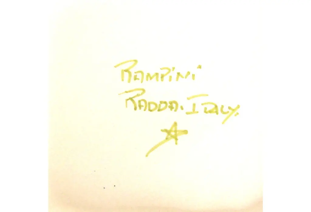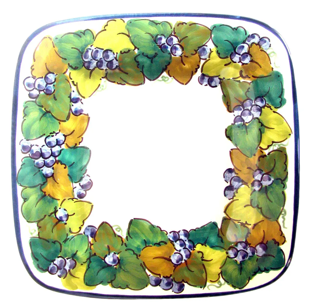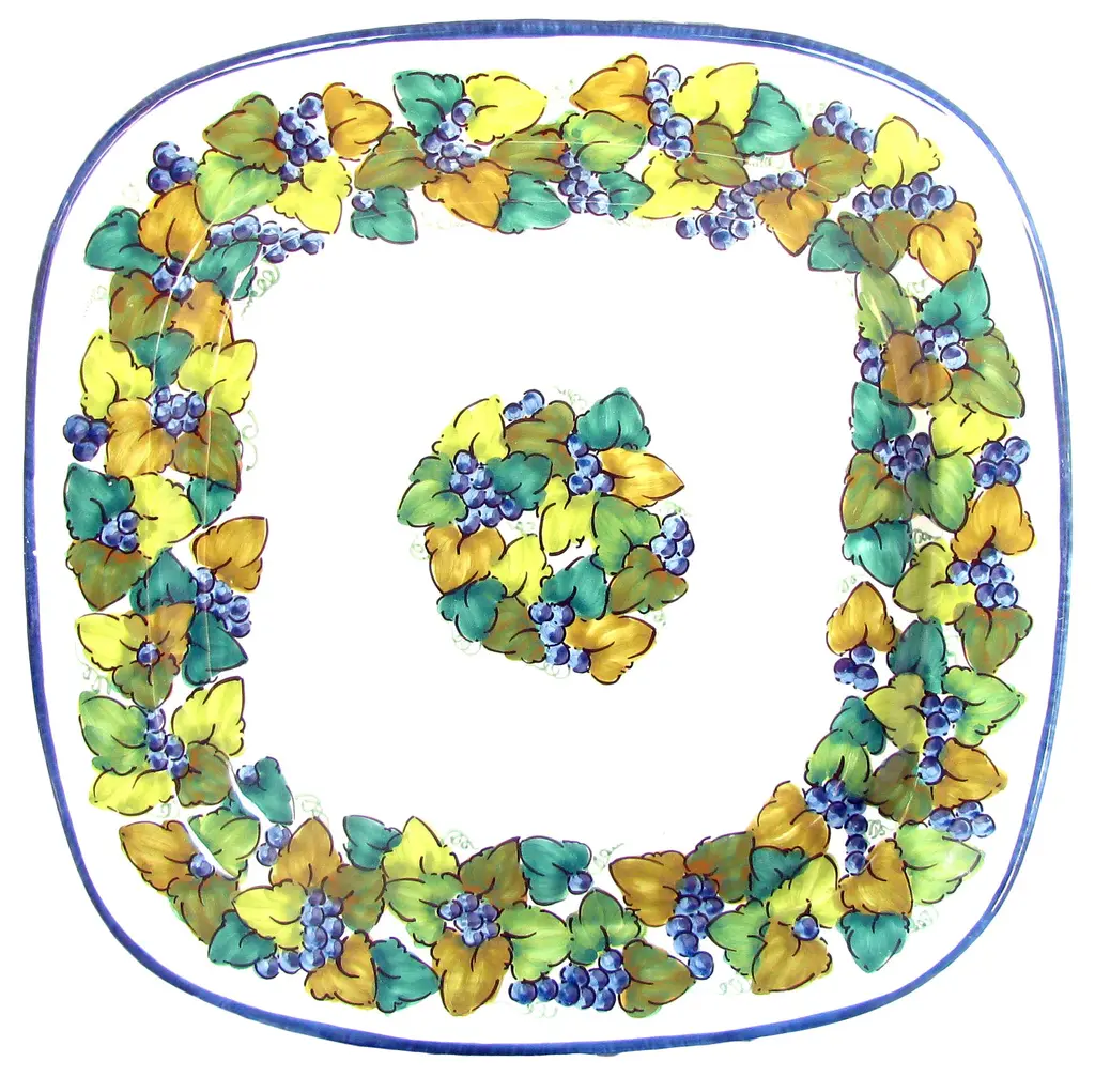 Italian artisan made platter and 8 matching square plates in the Vignes (vines) pattern. Hand-made and hand-painted by the Rampini Ceramics house of Radda (Siena) Italy, this set is perfect for serving salads, luncheon fare, or desserts. Dimensions: platter, 16" square; plates, 9" square. Two sets (platter + 8 plates each) are available. Excellent condition with no chips, no crazing, no cracks; minor irregularities of artisan made pieces.