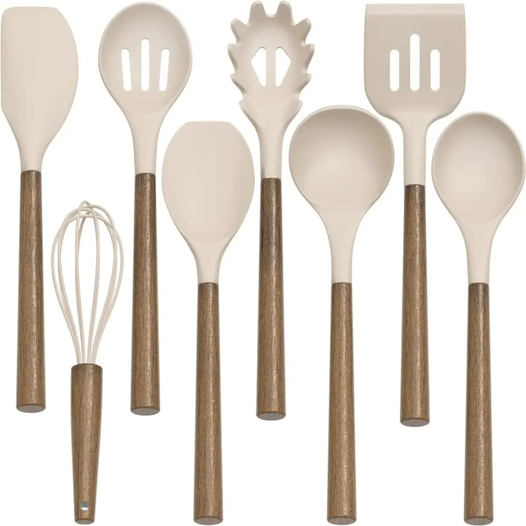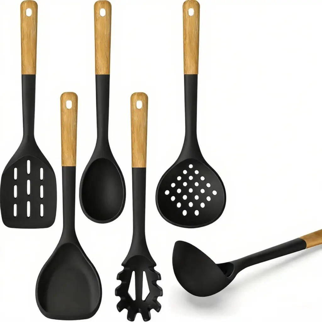 Upgrade your kitchen with this 10 - piece wooden utensil set. Made from 100% teak, a strong and durable hardwood, these utensils are a must - have for any home cook. The set includes spatulas, ladles, tongs, and more, covering all your cooking needs. They are non - stick and non - scratch, making them ideal for use with non - stick cookware, protecting your investment. Easy to clean, just hand wash with warm water and dry thoroughly. Each utensil has a hanging hole for convenient storage. Whether you're frying, stirring, or serving, these utensils will make your cooking experience more enjoyable and efficient.