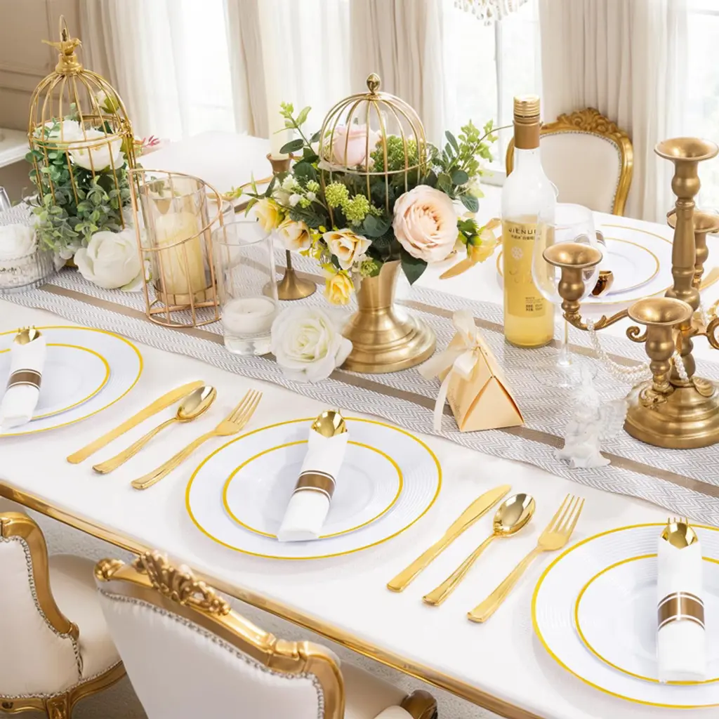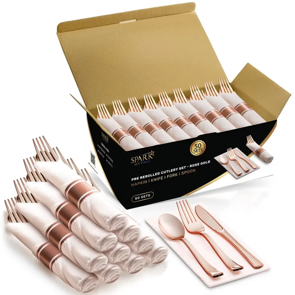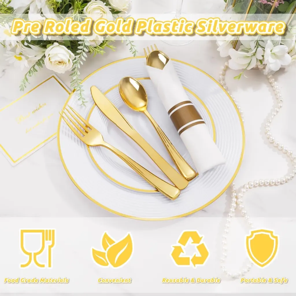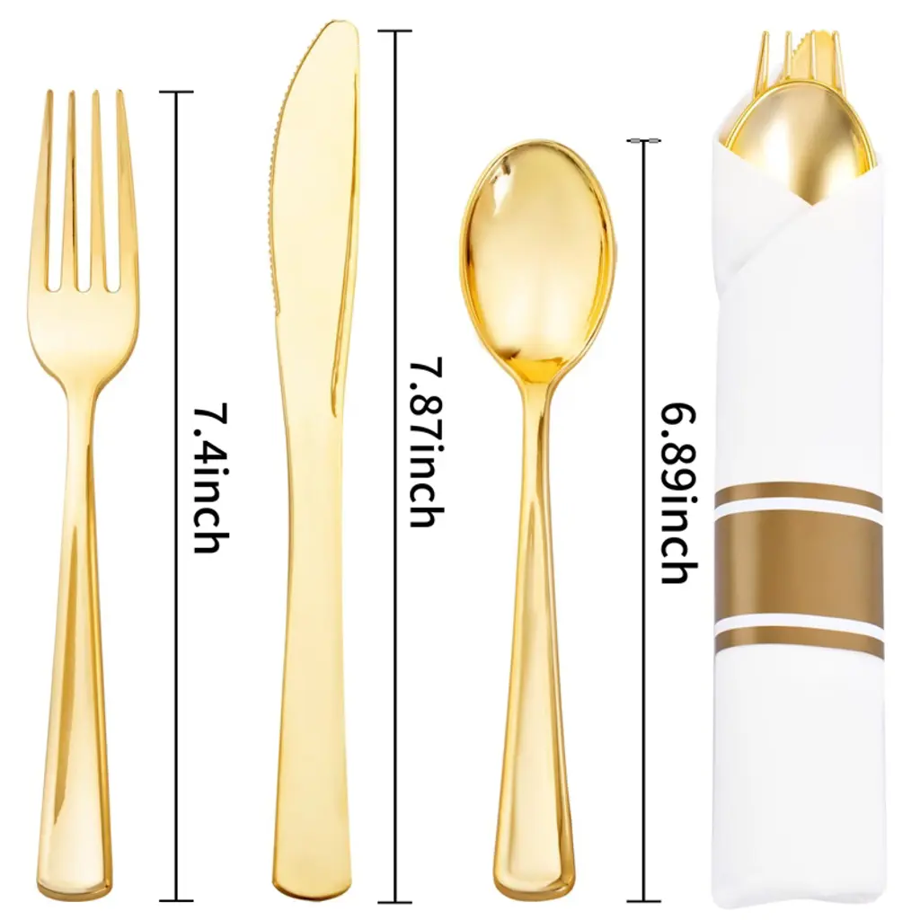 Looking for the perfect disposable cutlery set for your next event? Our 100 - pack pre - rolled gold silverware and napkin set is the answer. Made from premium, non - toxic plastic, it's strong and durable. Each pack comes with 100 forks, 100 knives, 100 spoons, and 100 napkins. The elegant design makes it suitable for all kinds of parties, from weddings to holiday celebrations. It's incredibly easy to use; just grab a pre - wrapped set and start dining. And the best part? No cleaning required! After the party, simply throw them away. Whether it's a small family gathering or a large corporate event, this cutlery set will add a touch of sparkle and convenience, making your occasion unforgettable.