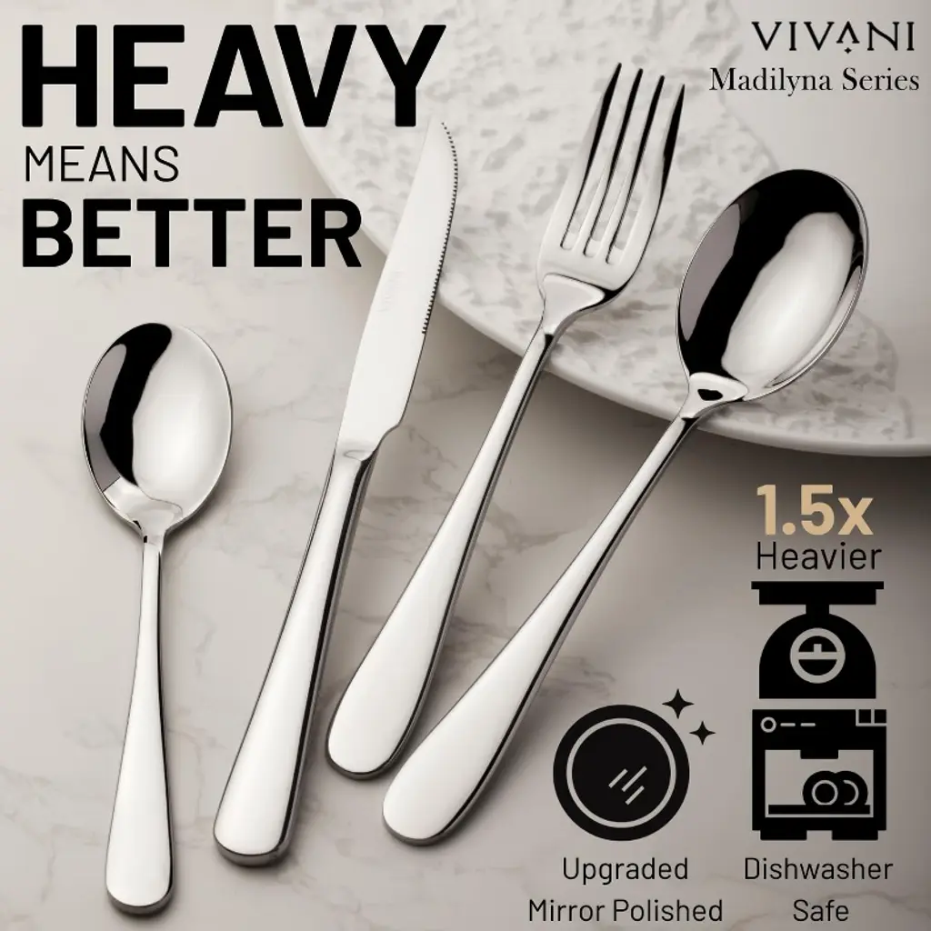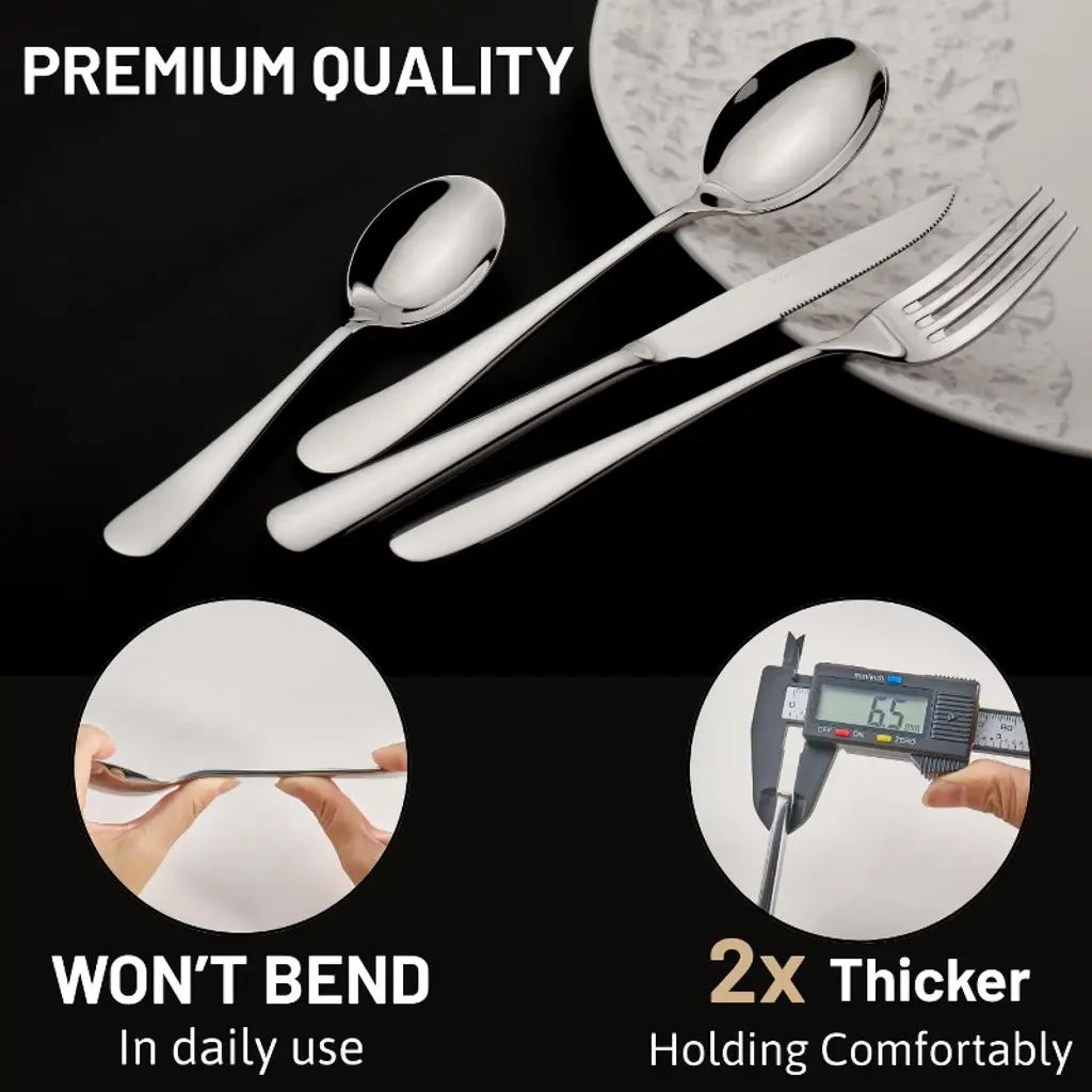 Upgrade your dining experience with this 16 - piece heavy - duty silverware set. Each piece is crafted from high - performance 18/0 stainless steel using an advanced hot forged process, making it 2x thicker and 1.5x heavier than normal flatware. The set includes 4 dinner forks, 4 dinner spoons, 4 dessert spoons and 4 steak knives, catering to all your dining needs. With a classic round handle design and high mirror polish, it fits any table style and adds a touch of elegance. It's suitable for a wide range of occasions, from daily family meals to formal weddings. The set comes in a well - made gift box, making it a great present. It's dishwasher safe, but if you choose to hand - wash, just dry it before storing and avoid hard - material cleaning tools. This set is a must - have for your home, dorms, restaurants or cafes, bringing convenience and style to your dining.