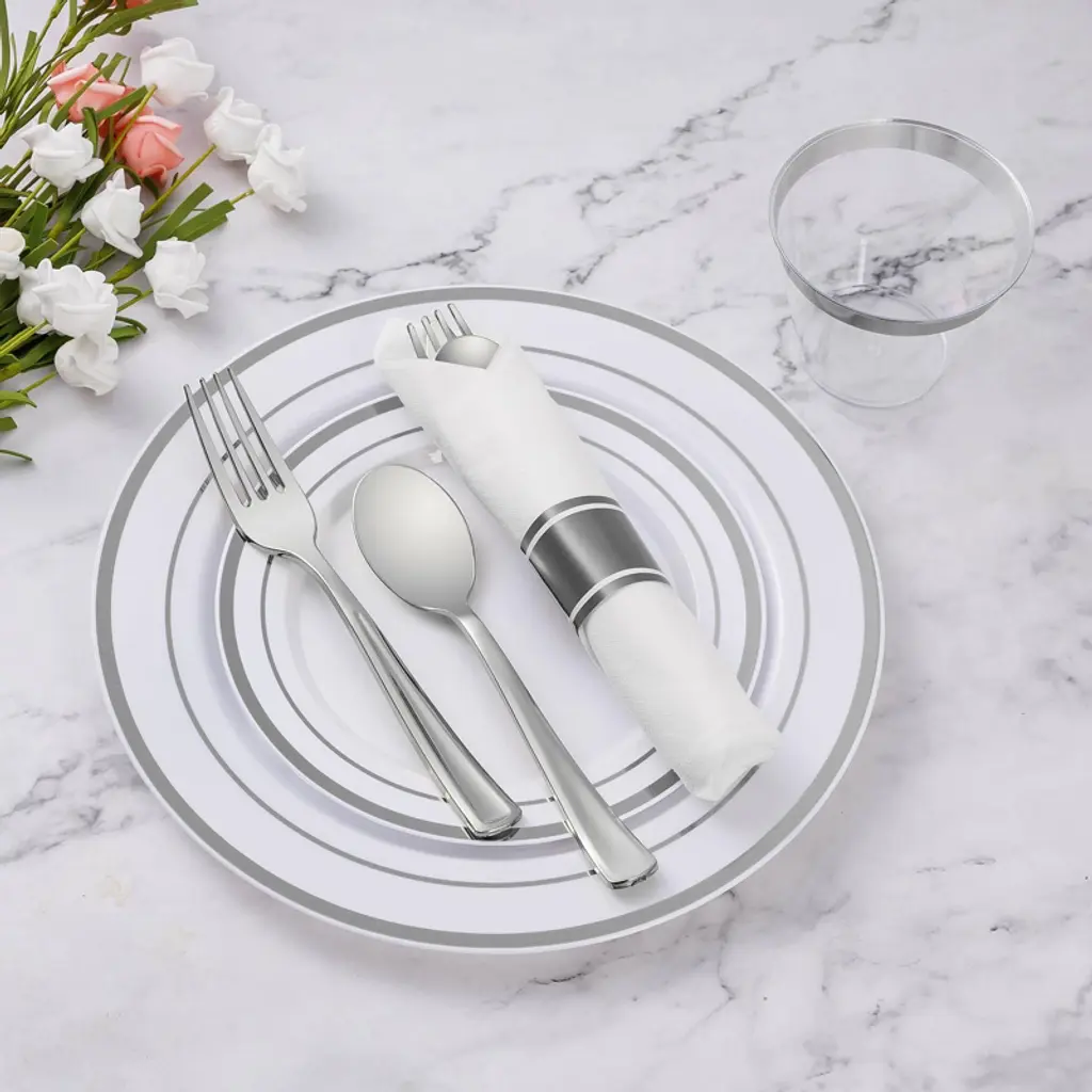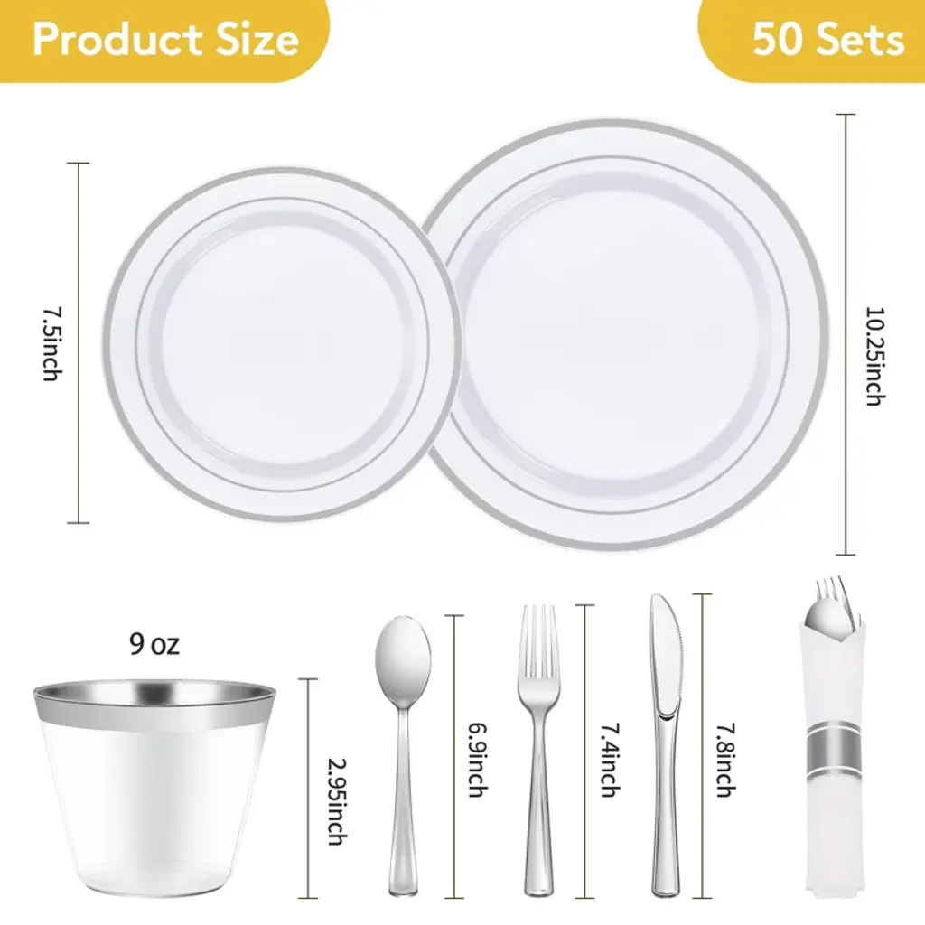 Looking for the perfect party supplies? This set of 350 pieces is ideal for hosting events for 50 guests. It includes 50 dinner plates, 50 dessert plates, 50 pre - rolled napkins, 50 cups, and 50 sets of silverware. The plates, cups, and napkins are made of hard, BPA - free, food - grade plastic. They're sturdy enough to hold hot, cold, and wet food without leaking or spilling. The elegant silver - rimmed design gives them a premium look similar to porcelain, making them suitable for any occasion, such as weddings, holidays, and business parties. After use, you can simply throw them away to avoid the cleanup. If you want to reuse them, just wash with water. Note that they're not for the microwave or dishwasher. This set provides a convenient and stylish solution for your party needs.