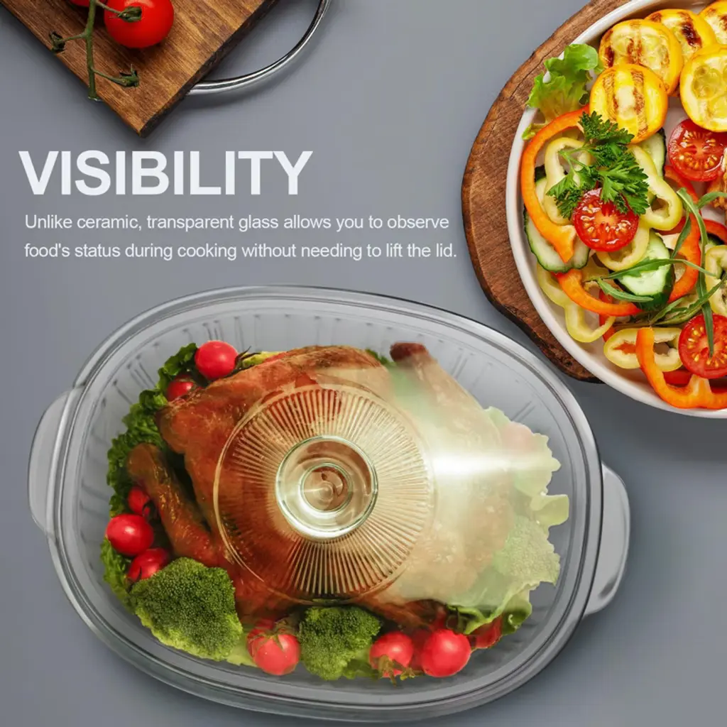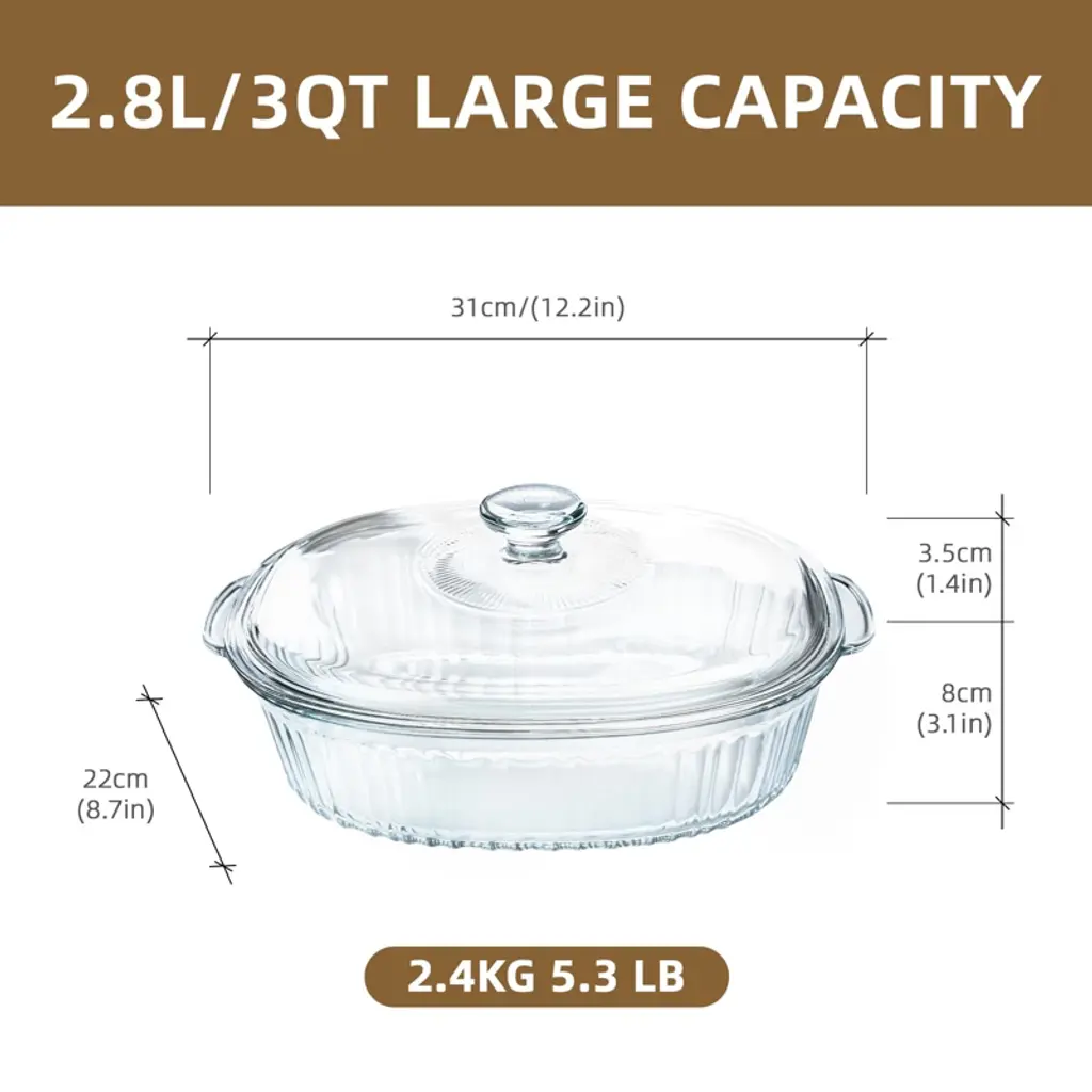 Discover the perfect kitchen companion! This casserole dish is made of high borosilicate glass, ensuring even heat distribution and preventing food odor absorption. It has a generous 3 - quart (2.8L) capacity, suitable for prepping, baking, serving, and storing a wide variety of dishes. The elegant ribbed oval design and clear glass add a touch of sophistication to any table. The wide handles make it easy to carry, and the glass lid with a knob seals in heat and moisture. You can monitor the cooking process without removing the lid. It's safe for use in the microwave, oven, freezer, and dishwasher, allowing you to reheat leftovers or store them easily. A versatile, user - friendly, and practical addition to your kitchen for family dinners or parties.