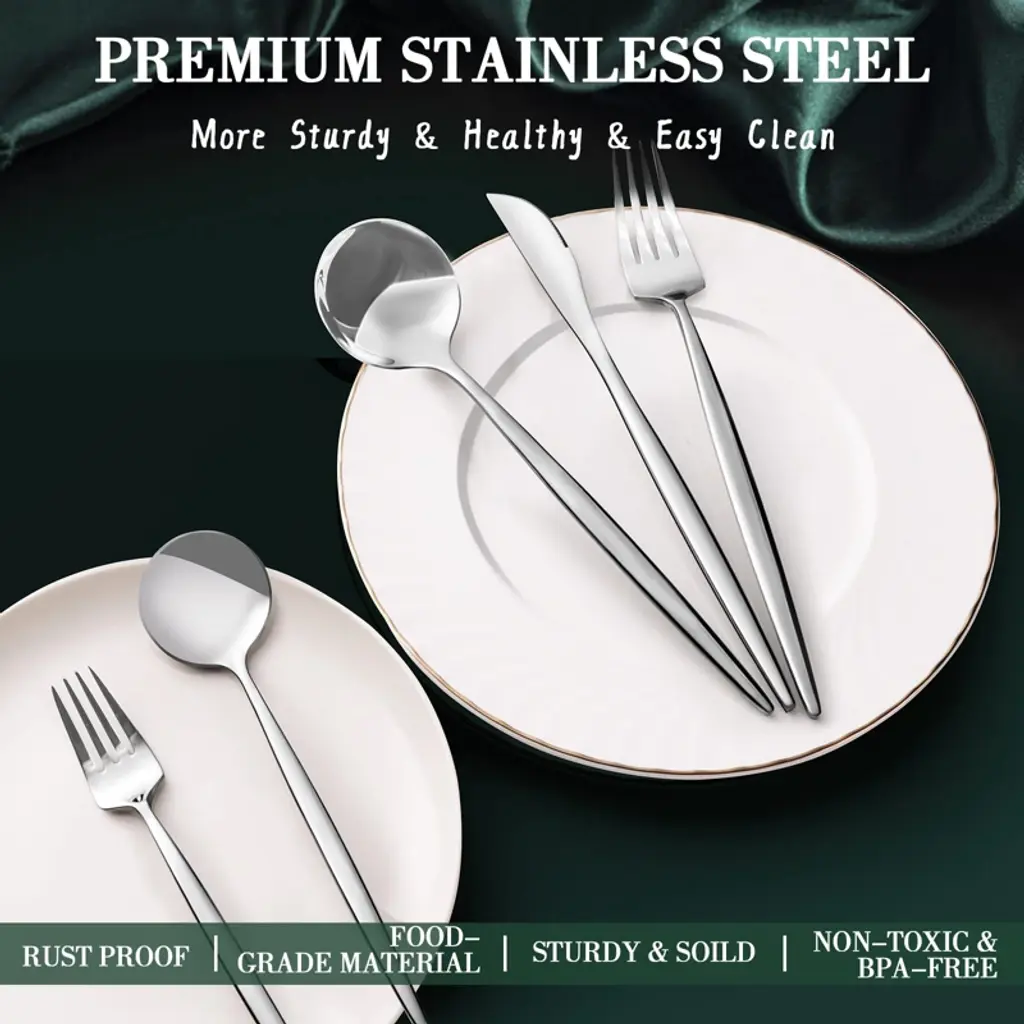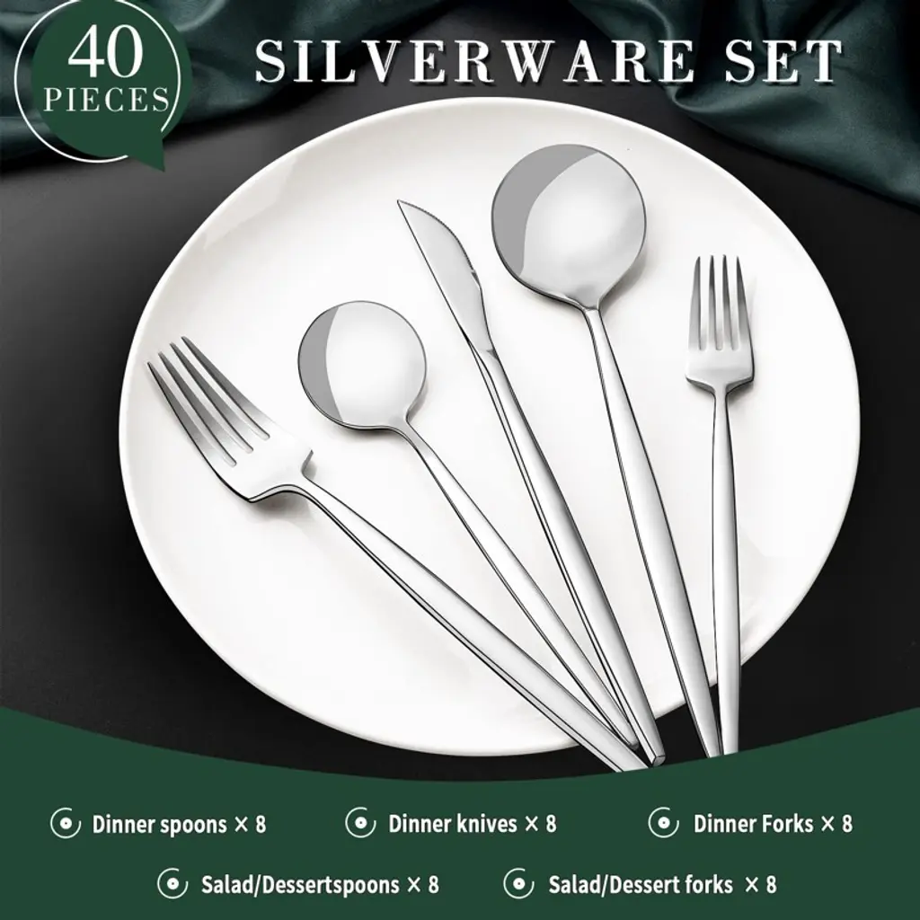 Upgrade your dining experience with this 40 - piece silverware set designed for 8 people. Crafted from extra - thick refined food - grade stainless steel, it's sturdy, corrosion and rust - proof, and nickel - free. The ergonomic handle design offers comfort while you eat. The set comes with 8 each of dinner forks, salad forks, dinner knives, dinner spoons, and teaspoons, making it a must - have for families or restaurants. Its smooth, mirror - polished surface not only looks elegant but also makes it easy to clean as it's dishwasher safe. The sharp steak knives can slice through meat effortlessly. Whether it's a daily meal at home, a wedding celebration, or a camping trip, this silverware set is your perfect companion, bringing convenience and style to every dining occasion.
