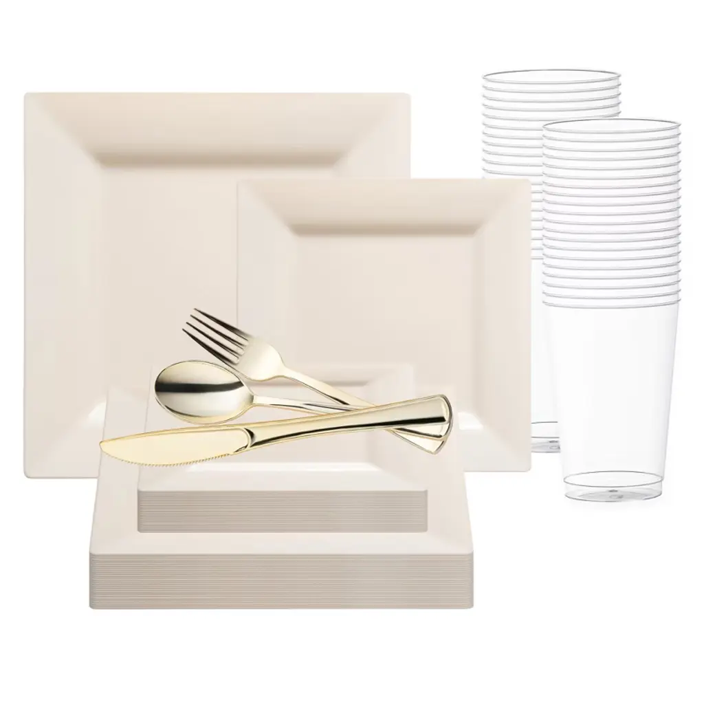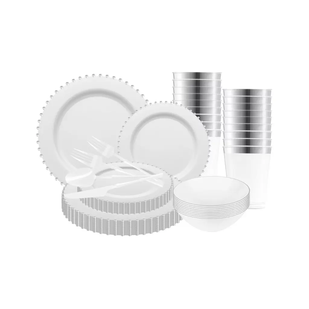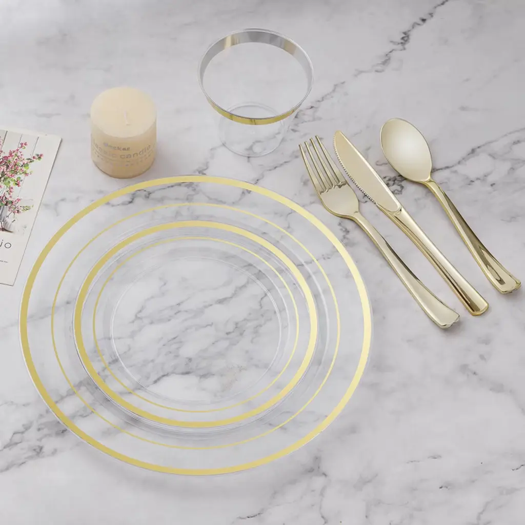 Looking for the perfect dinnerware set for your party? Our 600 - piece disposable dinnerware set is the answer. It includes 100 dinner plates, 100 salad plates, 100 cups, and 100 each of knives, forks, and spoons, suitable for a 50 - guest party. Crafted from heavy - duty and BPA - free materials, it ensures both durability and food safety, though it's not microwave - safe. The elegant color - coordinated design makes it blend well into any occasion, offering the charm of real china without the matching trouble. Whether it's a lavish wedding or a daily gathering, this set simplifies your life. After the party, you can either toss the disposable and recyclable plates or wash them for reuse. It's a great choice for Christmas, New Year, and other celebrations, allowing you to focus on enjoying the moment with your guests rather than worrying about cleaning up.