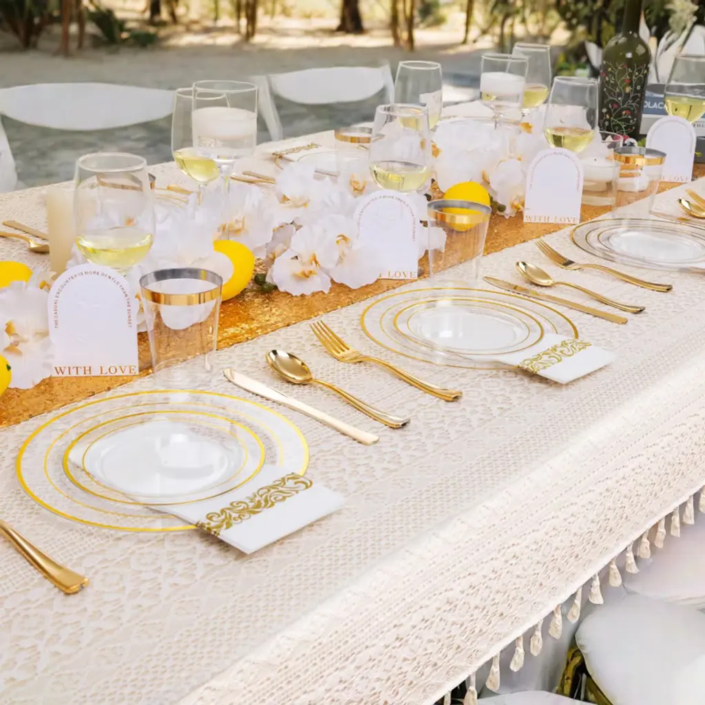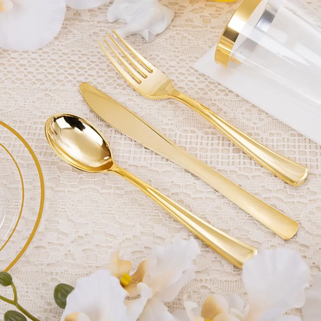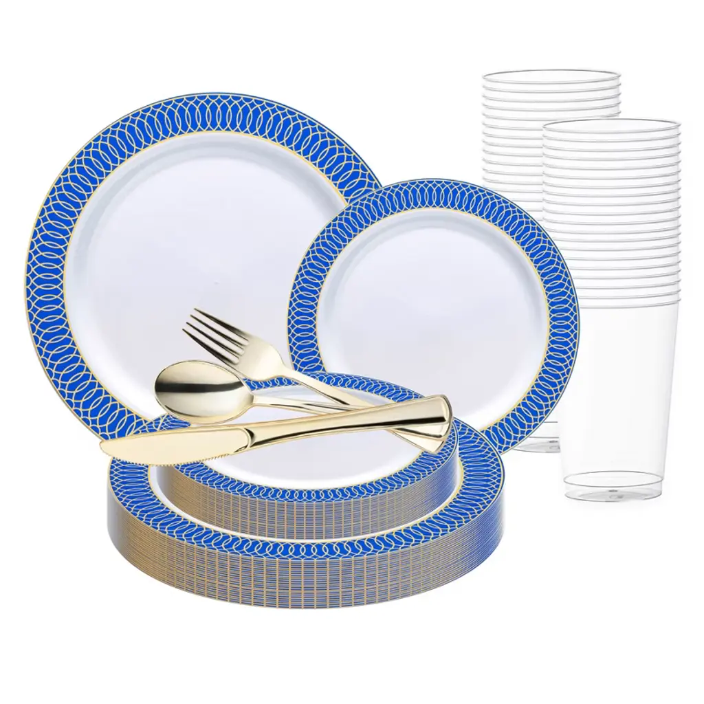 Looking for the perfect dinnerware set for your big party? Our 700 - piece disposable set is the answer! Crafted from high - quality, food - grade plastics that are 100% BPA - free, it ensures food safety. This set is designed for 100 guests and includes various items like plates, cups, napkins, and silverware. The heavy - duty plastic makes it durable, able to hold hot and cold food without deforming. You can either dispose of it after the party or wash it for future use. The elegant gold design with a transparent center on the plates enhances the look of your food, while the inlaid gold lace adds a touch of luxury. It's not just for serving food; it can also be used as a stylish table decoration. Suitable for a wide range of events such as weddings, holidays, and business parties, it brings convenience and style to your dining experience.
