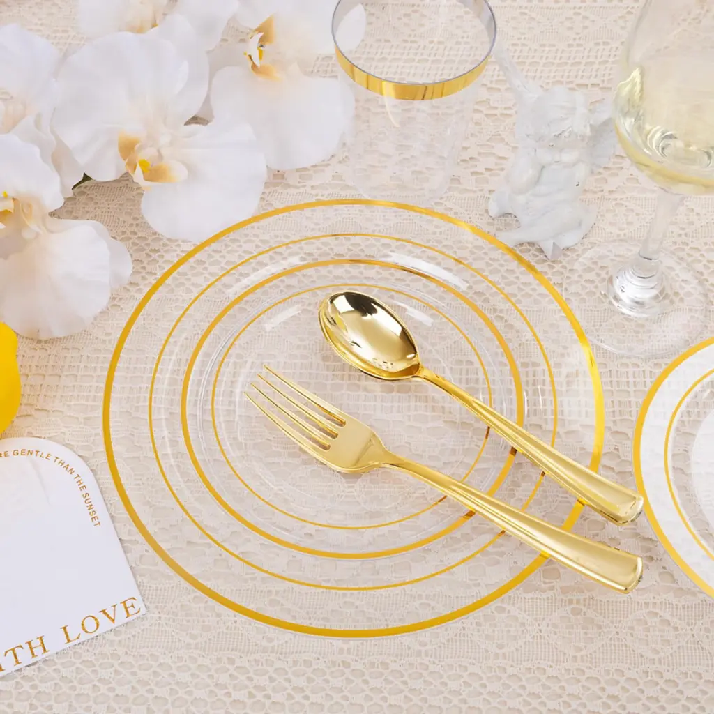Itopfox 700-piece Gold Dinnerware Set For 100 Guests - Clear Disposable Plates, Cups, Napkins & Silverware For Parties, Weddings & Events