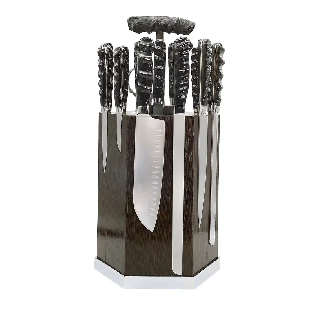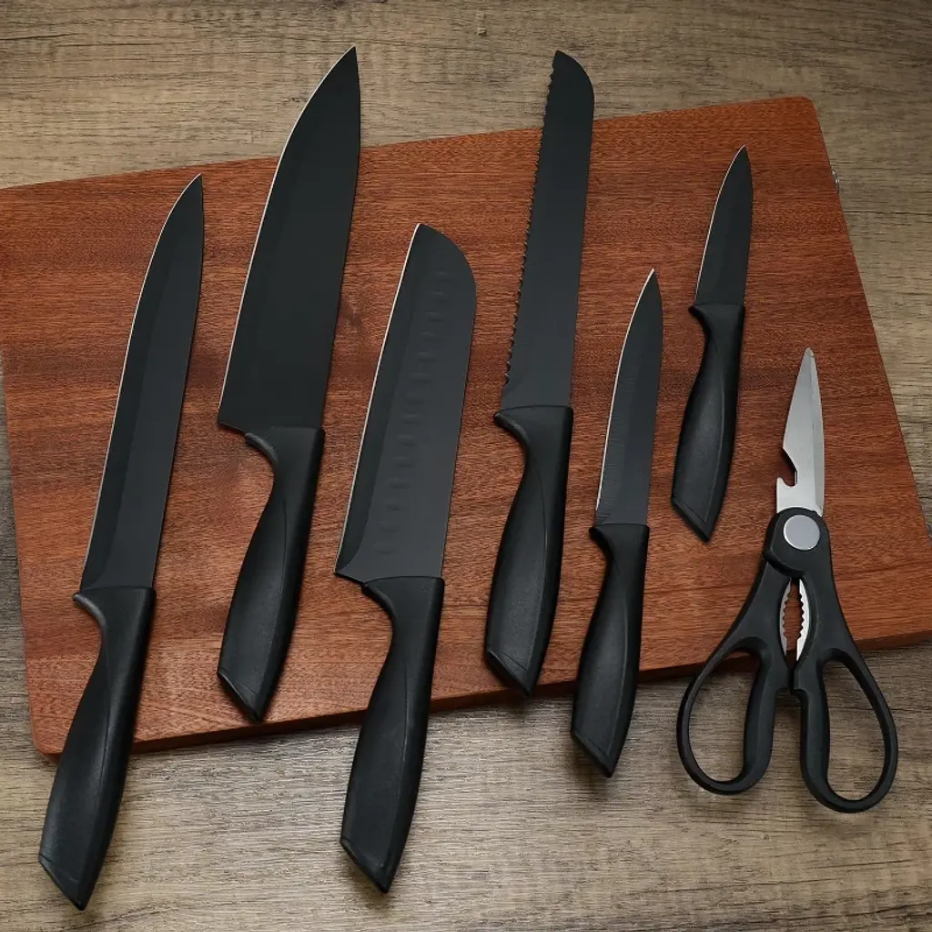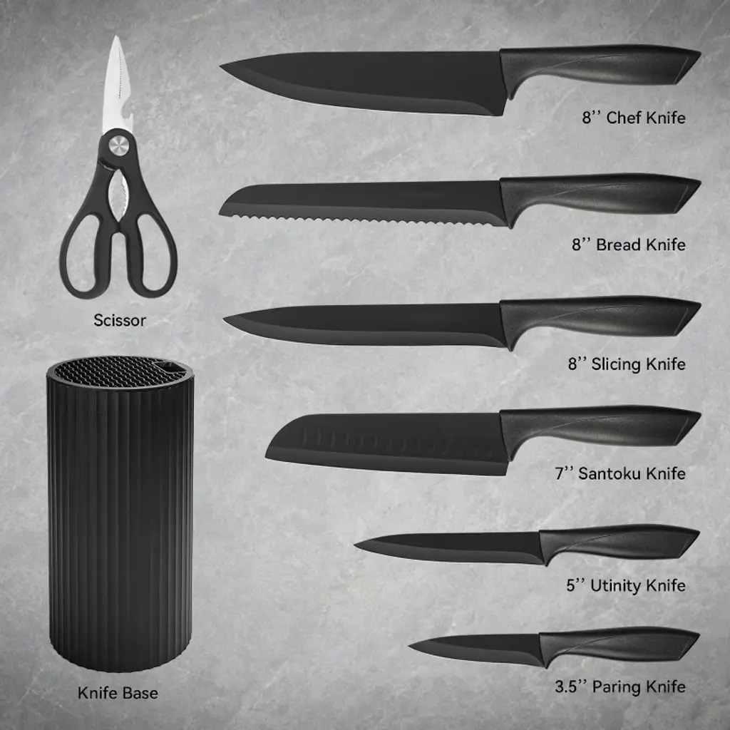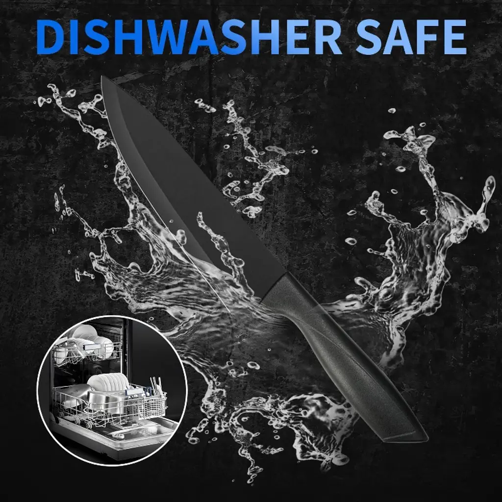 Upgrade your kitchen with this 8 - piece kitchen knife set. It's a comprehensive set that includes an 8 - inch chef's knife, a 7 - inch Santoku knife, an 8 - inch serrated bread knife, a 5 - inch utility knife, a 3.5 - inch paring knife, 1 kitchen shear, and a kitchen knife block. The knives are made of high - quality materials with a non - stick and rust - resistant black coating, which prevents steel oxidation and ensures a long lifespan. Each knife is carefully sharpened for smooth and efficient cutting. Whether you're slicing, dicing, or chopping, these knives will be your great helpers. They are dishwasher - safe, so you can clean them easily and dry them for storage. The ergonomic design makes them comfortable to hold, reducing hand fatigue. Ideal for professional chefs or home cooks, this knife set will bring convenience to your daily cooking.