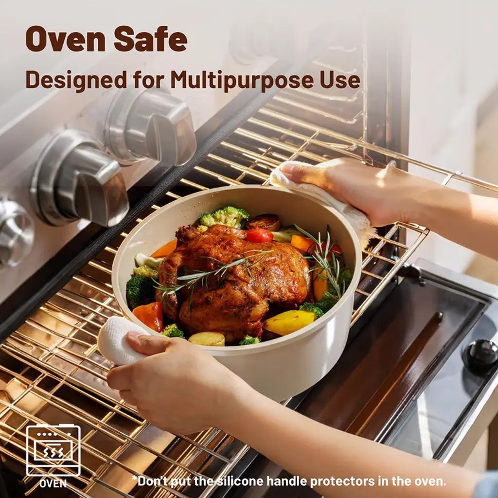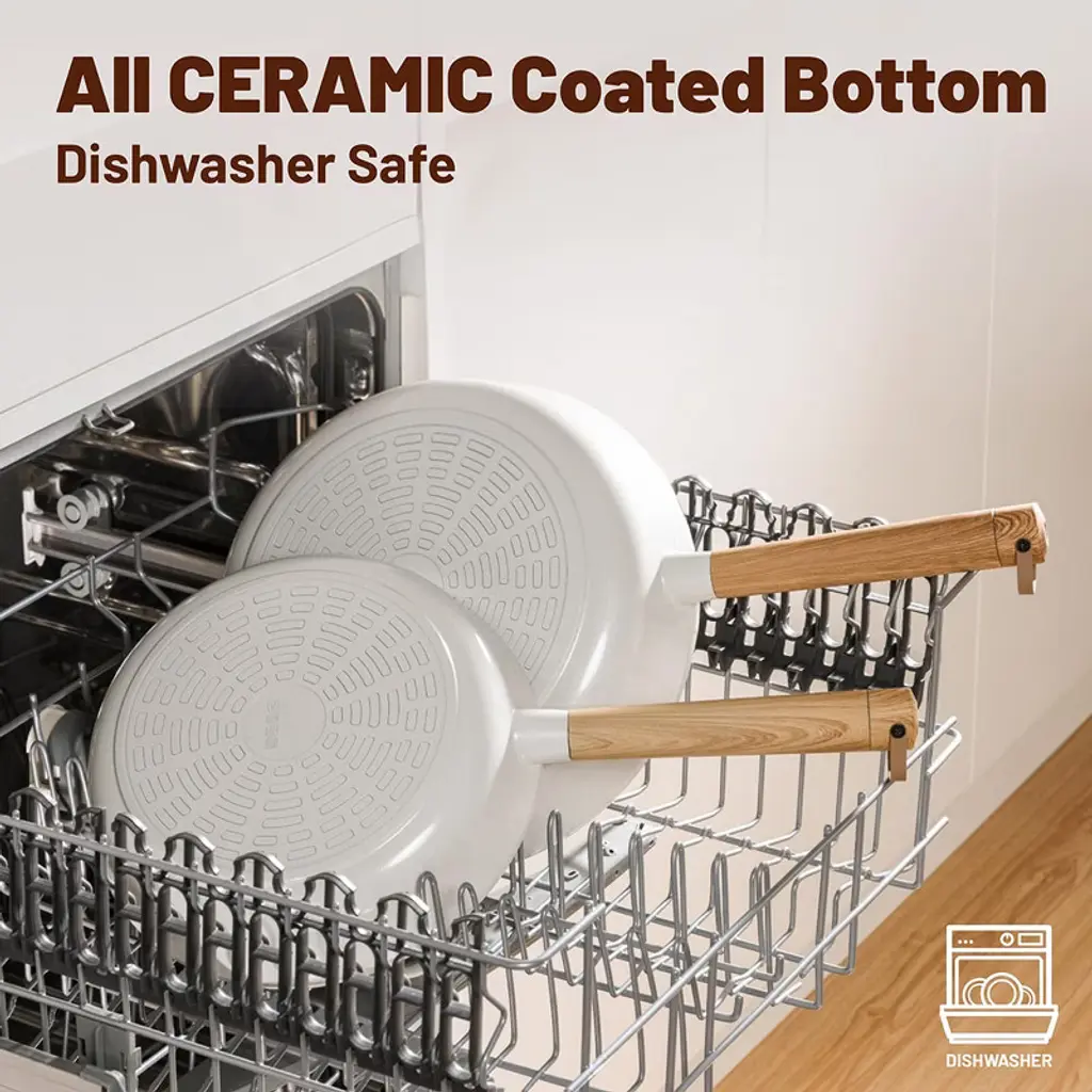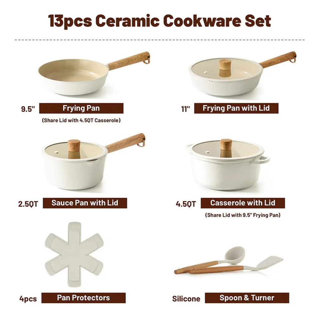 Upgrade your kitchen with this 13-piece nonstick cookware set. It features an all-ceramic coating, free of harmful chemicals like PFAS/PTFE/PFOA/lead/cadmium, ensuring safe and healthy cooking with less oil. The innovative compound bottom design with a SUNSHINE bottom provides excellent heat gathering and fast, even heating, suitable for all cooktops including induction. The set is also dishwasher-safe. The swivel stay-cool handle and rotatable metal hook allow for easy storage, saving up to 70% of space. The woodgrain bakelite handle is comfortable to hold and stays cool during cooking. The pots and pans are oven-safe up to 550ºF when the handles are removed. The clear glass lid with a silicone rim has good sealing and is durable. This set includes various pans and useful accessories like silicone utensils and pot protectors, perfect for daily cooking and a great addition to any kitchen.