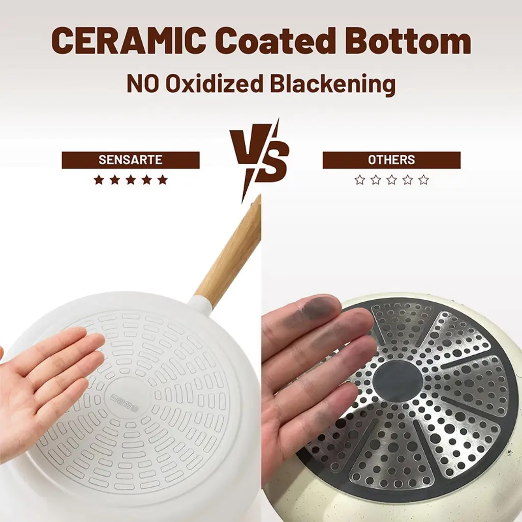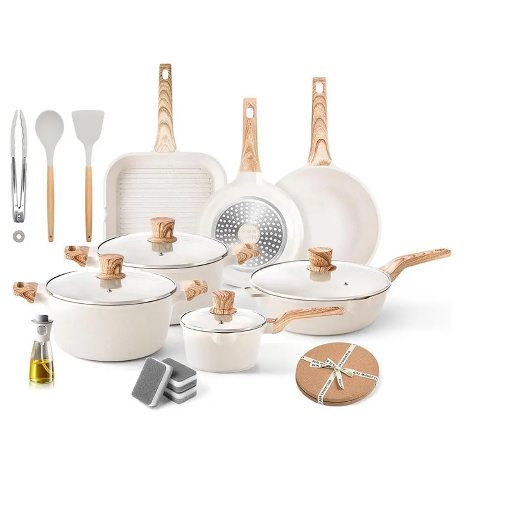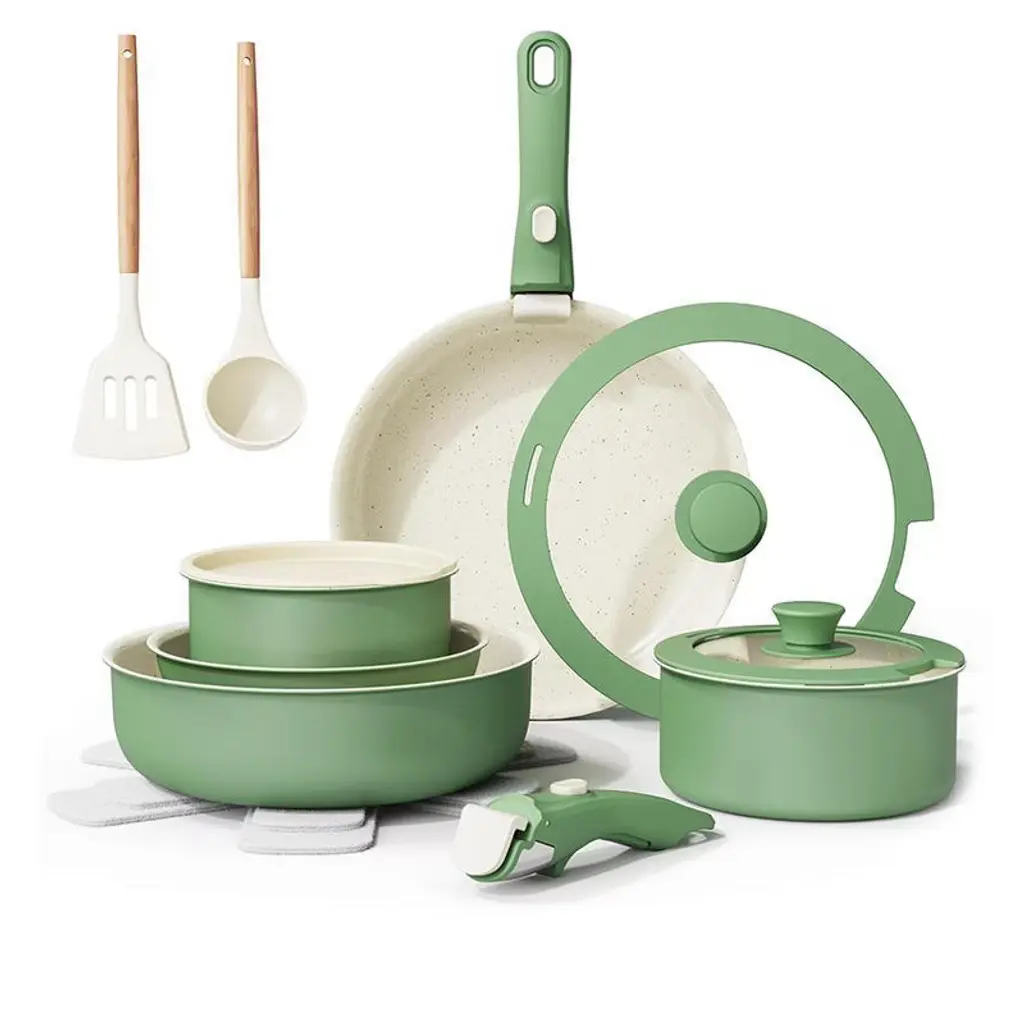 Upgrade your kitchen with this 13-piece nonstick cookware set. It features an all-ceramic coating, free of harmful chemicals like PFAS/PTFE/PFOA/lead/cadmium, ensuring safe and healthy cooking with less oil. The innovative compound bottom design with a SUNSHINE bottom provides excellent heat gathering and fast, even heating, suitable for all cooktops including induction. The set is also dishwasher-safe. The swivel stay-cool handle and rotatable metal hook allow for easy storage, saving up to 70% of space. The woodgrain bakelite handle is comfortable to hold and stays cool during cooking. The pots and pans are oven-safe up to 550ºF when the handles are removed. The clear glass lid with a silicone rim has good sealing and is durable. This set includes various pans and useful accessories like silicone utensils and pot protectors, perfect for daily cooking and a great addition to any kitchen.