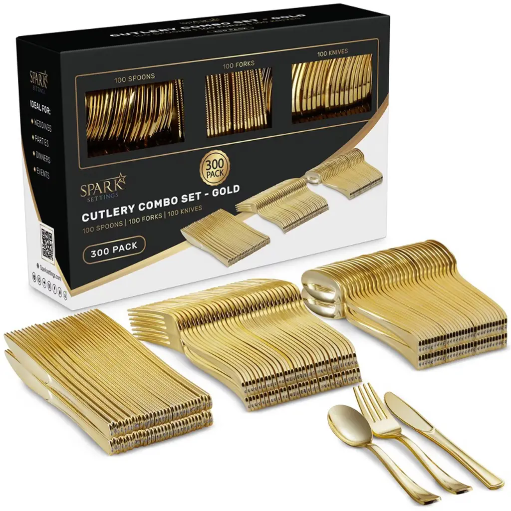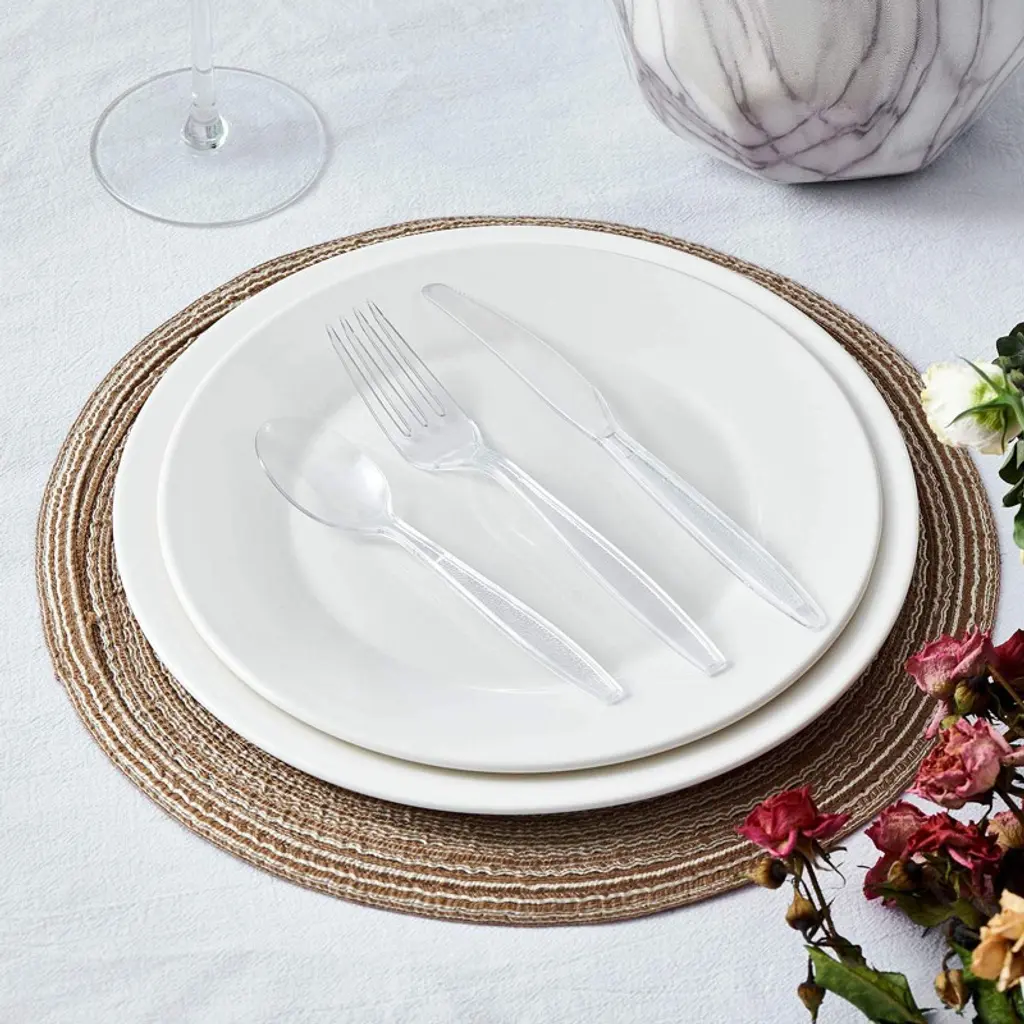 Looking for a practical and elegant cutlery solution? Our cutlery set is the answer. It consists of 300 pieces of clear plastic forks, spoons, and knives. Made of BPA - free polystyrene plastic, it's sturdier than average plastic cutlery, able to handle most temperature - intensive foods. The forks have long teeth, smooth edges, and are easy to grip, so you won't drop your food. It's disposable, saving you the hassle of dish - washing, yet still offers an elegant look. What's more, it can be reused if washed with warm water and soap. The set comes in a durable cardboard box, which is convenient for both use and storage. It's perfect for any indoor or outdoor occasion, such as parties, weddings, and BBQs, and can be used at home, school, office, or restaurant. Get this cutlery set and enjoy the convenience it brings to your life.