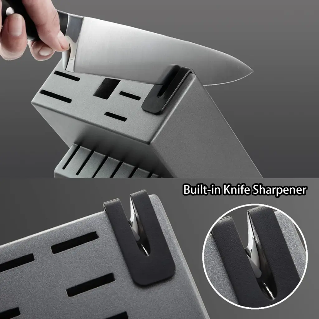 Discover this exceptional kitchen knife set that is a must - have for any kitchen. Crafted from high - quality stainless steel, these knives are tarnish and rust - resistant, meeting restaurant - grade quality. The set features a built - in sharpener, eliminating the need to search for a separate one. It's a great choice for both novice and seasoned cooks. With a full tang, stainless steel endcap, and triple - rivet construction, the knives are built to last. The ergonomic handle ensures a comfortable and secure grip. There are 15 pieces in total, including an 8 - inch chef knife, 8 - inch slicing knife, 5 - inch santoku knife, and more, suitable for all types of cutting tasks in daily cooking. The knives are stored in a graphite hard - wood knife block with a built - in sharpener, providing space - efficient storage while keeping the blades razor - sharp. For cleaning, simply hand - wash the knives, and the stainless blades will remain rust - free. Upgrade your kitchen experience with this versatile and durable knife set.