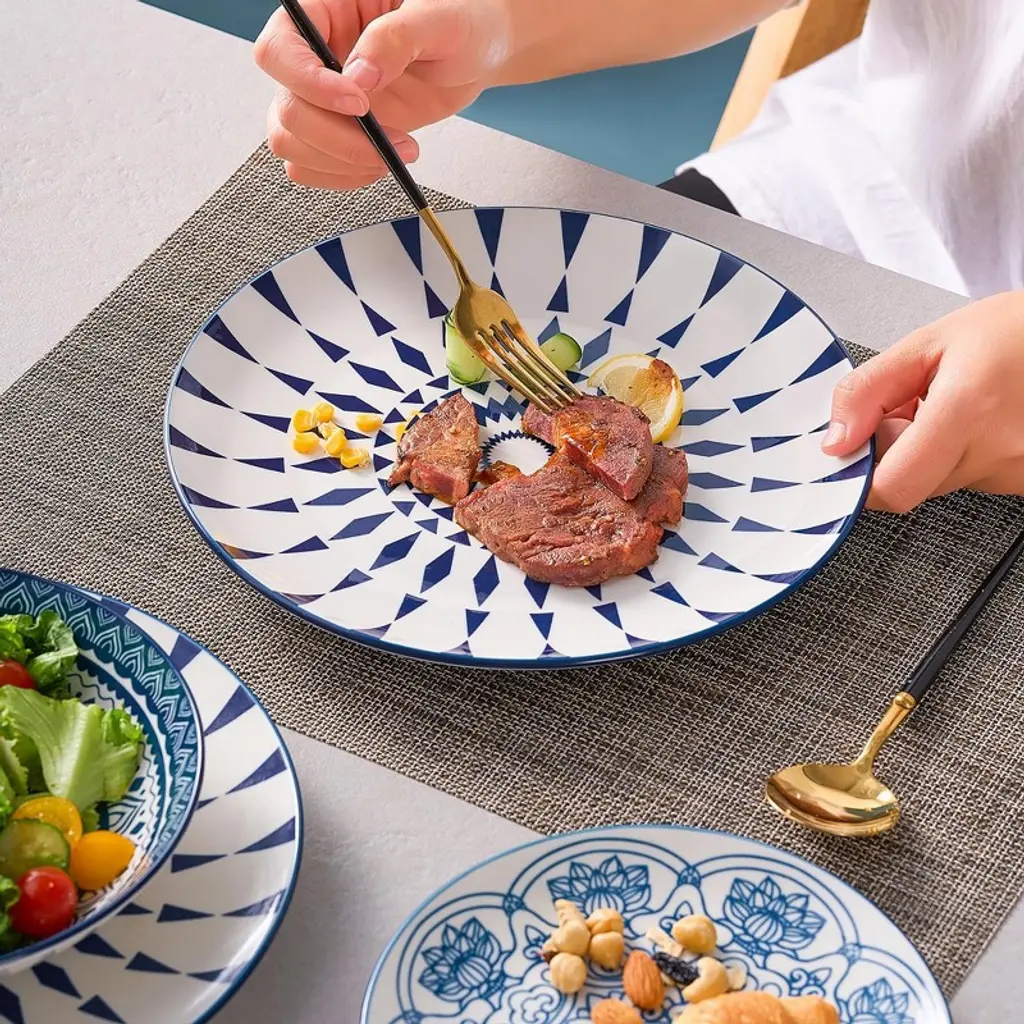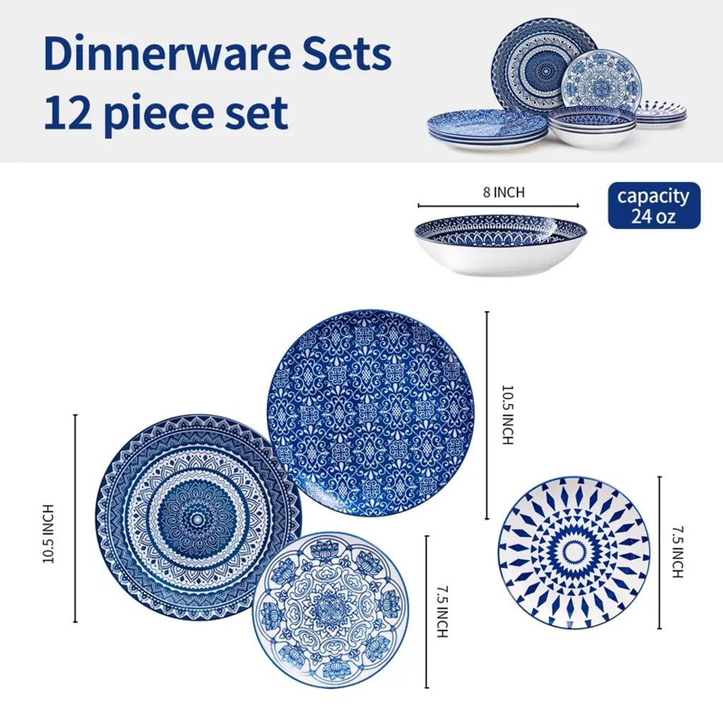 Itopfox Porcelain Dinnerware Set For 4, 12-piece Hand-drawn Plates & Bowls Handmade Ceramic Dish Set Chip-resistant Dishwasher & Microwave Safe Blue