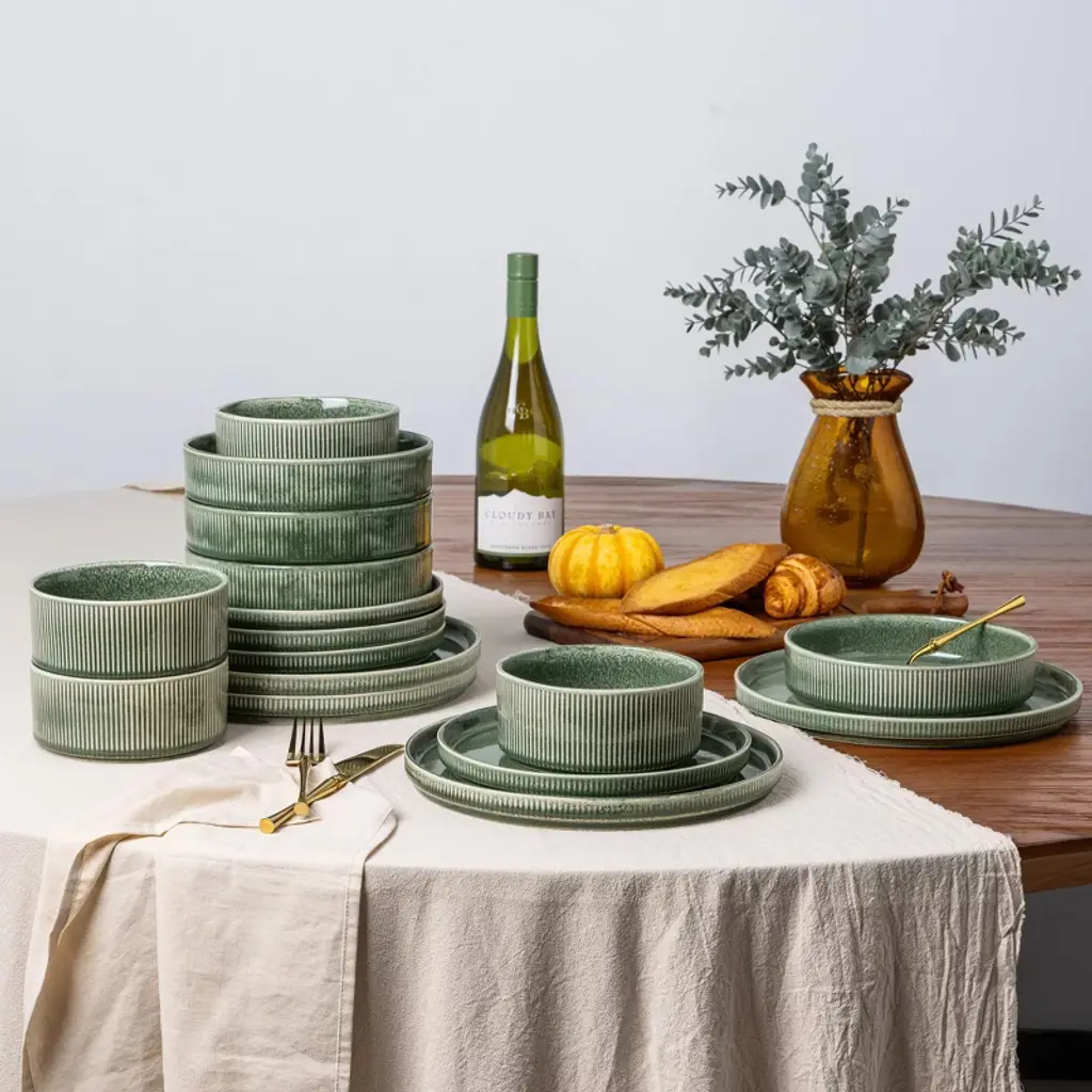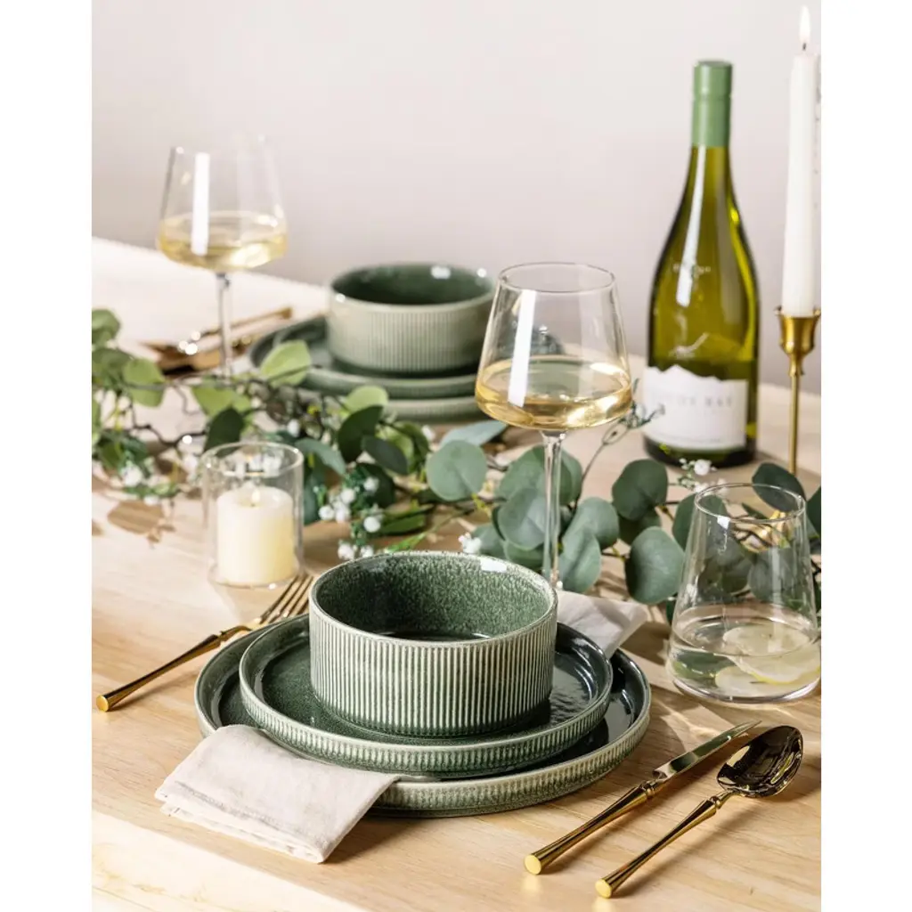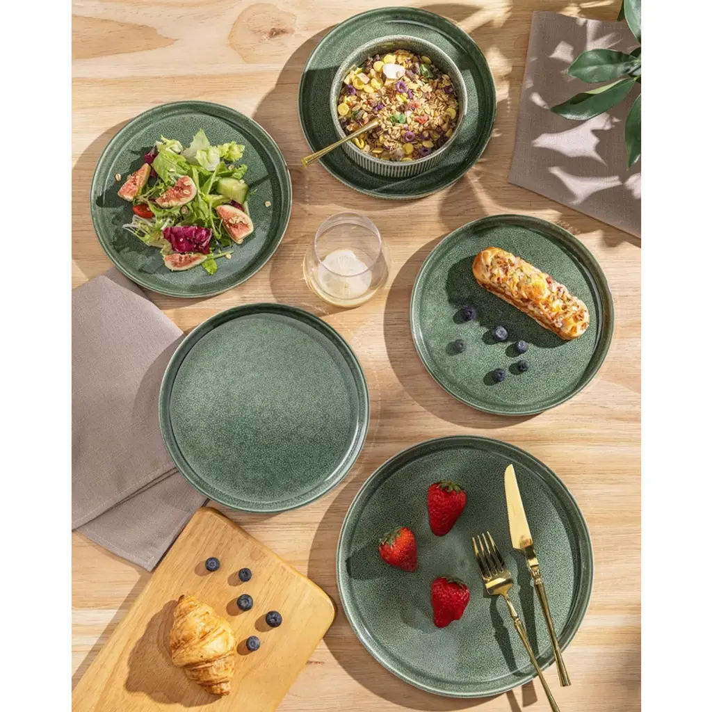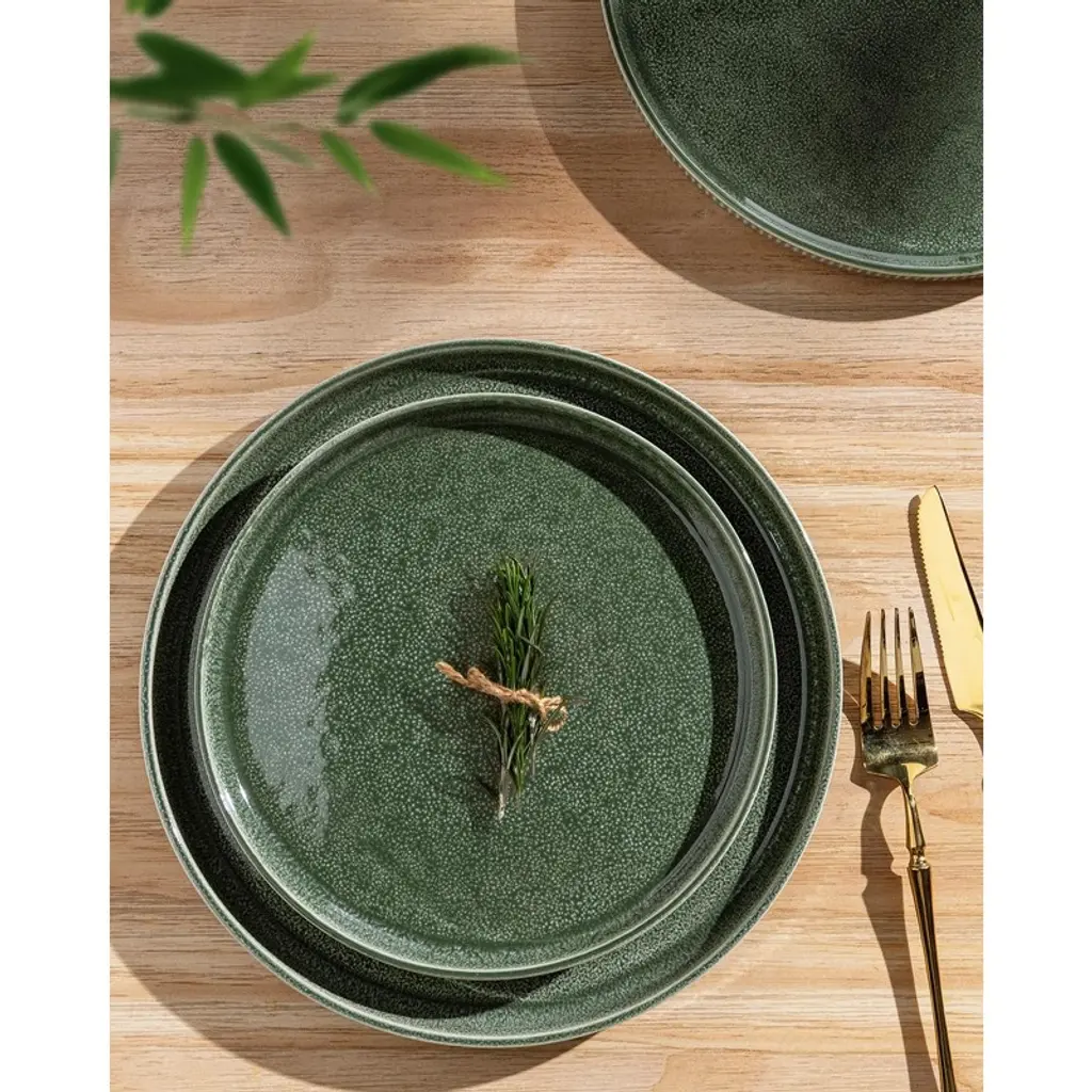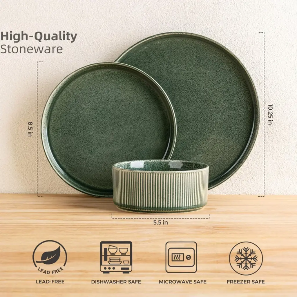 Discover this high - quality dinnerware set crafted from premium double - fired ceramic. It's lead - free and cadmium - free, ensuring a healthy dining experience. The unique reactive glaze on each handcrafted piece adds sophistication to your table. The modern minimalist design with a sauce - guard edge is both stylish and practical. This 12 - piece set offers full place settings for 4, perfect for daily meals and entertaining guests. It's incredibly convenient as it's dishwasher, microwave, and freezer safe, allowing for easy cleanup, quick reheating, and meal prep. With responsive customer service, you can shop with confidence and enjoy the convenience it brings to your dining life.