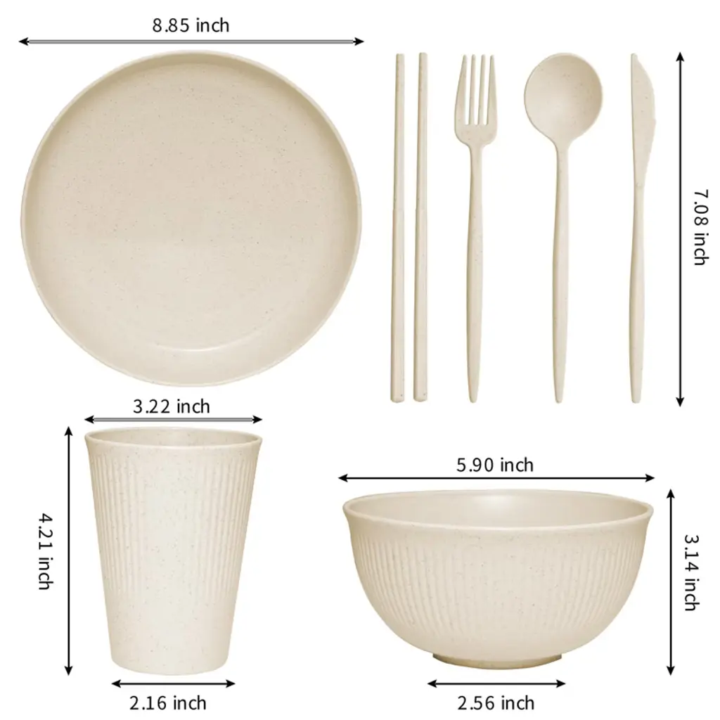 Discover this amazing 42-piece wheat straw dinnerware set! It comes with all the essentials - bowls, plates, cups, forks, spoons, knives, and chopsticks - to meet your daily dining needs. Crafted from natural degradable wheat straw fiber and food-grade PP material, it's 100% BPA-free, non-toxic, and environmentally friendly. You can use it directly with food without any concerns. The set is solid and durable, and its surface can be easily cleaned by hand or in the dishwasher. It's also microwave-safe, so you can use it in the microwave without worry. With its round edges, it's stackable and non-stainable, saving you space. Whether you're dining indoors or outdoors, for students, camping, or picnics, this lightweight and drop-proof dinnerware set is a perfect choice. It makes a meaningful gift for various occasions, bringing convenience and sustainability to your life.