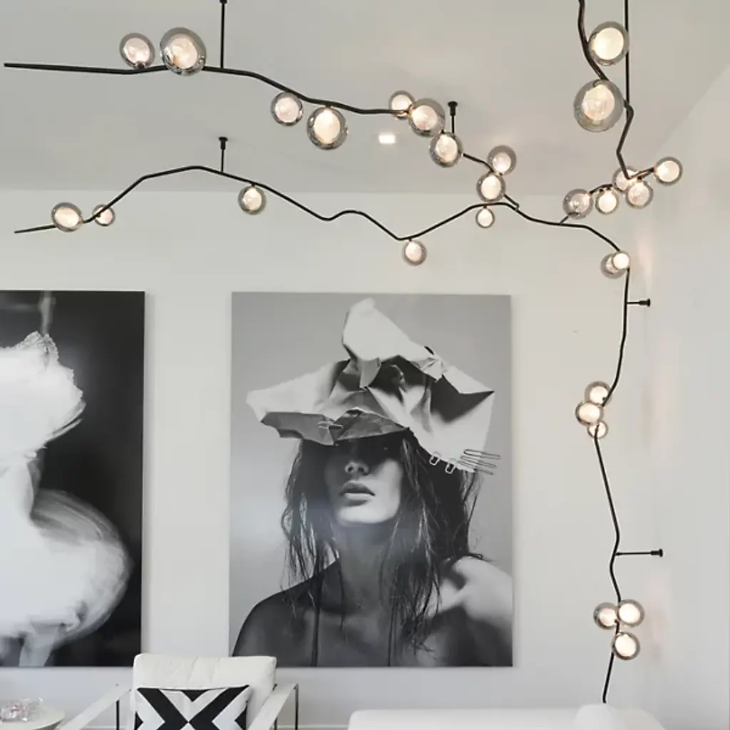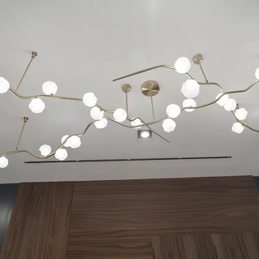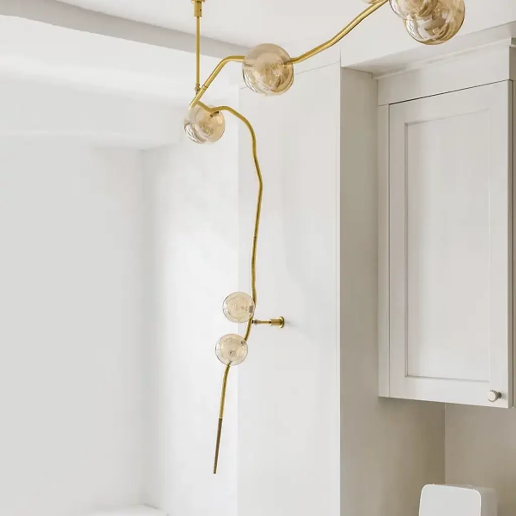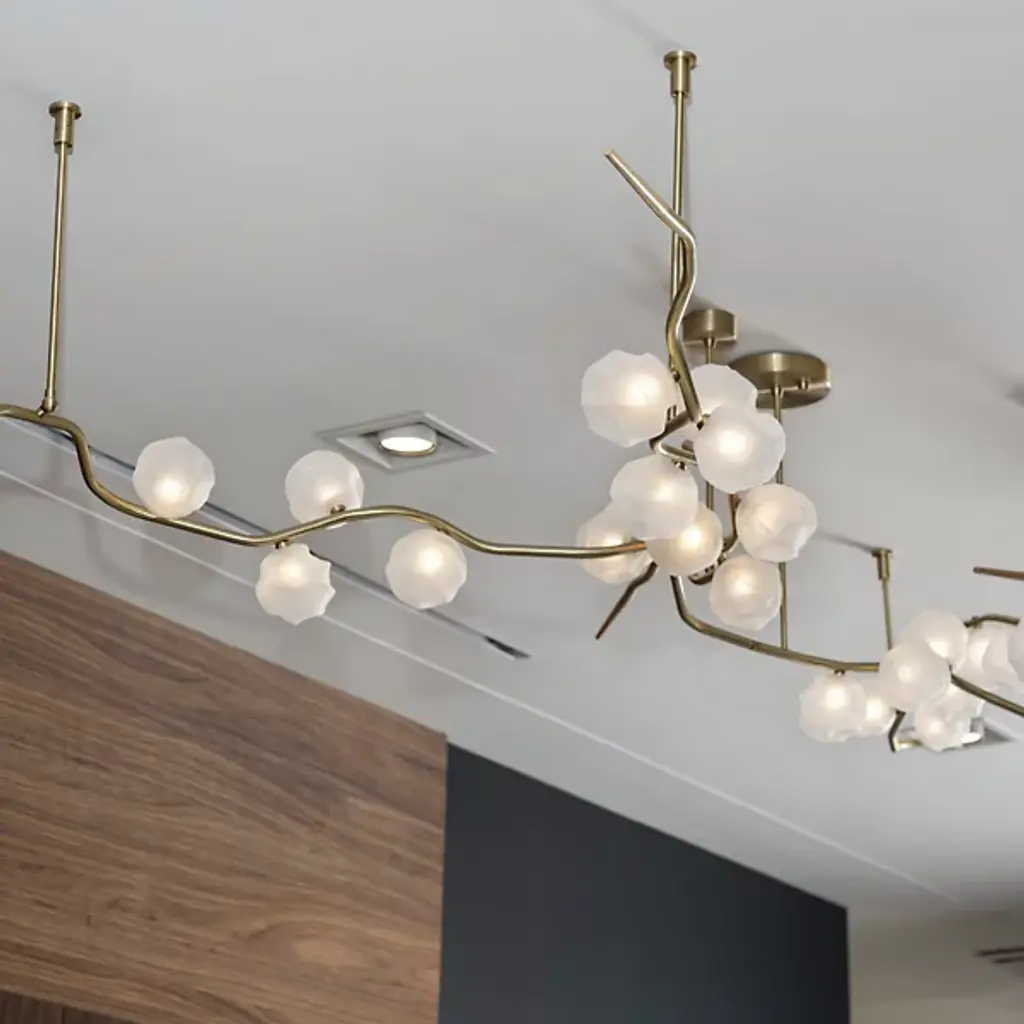 Elevate your space with the dynamic design of the Ivy Branch Configurable Multi-Lights & Systems from Shakuff. A richly textured, completely customizable creation made in the USA, this fixture blends contemporary simplicity with artistic charm. Its circular canopies extend slender downrods to twisting metal stems reminiscent of climbing vines, contrasting smooth suspension structures with clever curves. Wooden ferrules tipping each curling vine add natural warmth, while hand-blown glass shades, each with distinctive crumpled textures, enhance its organic, luminous beauty.