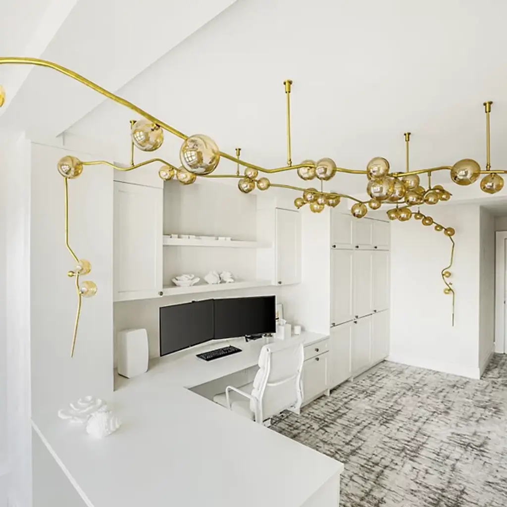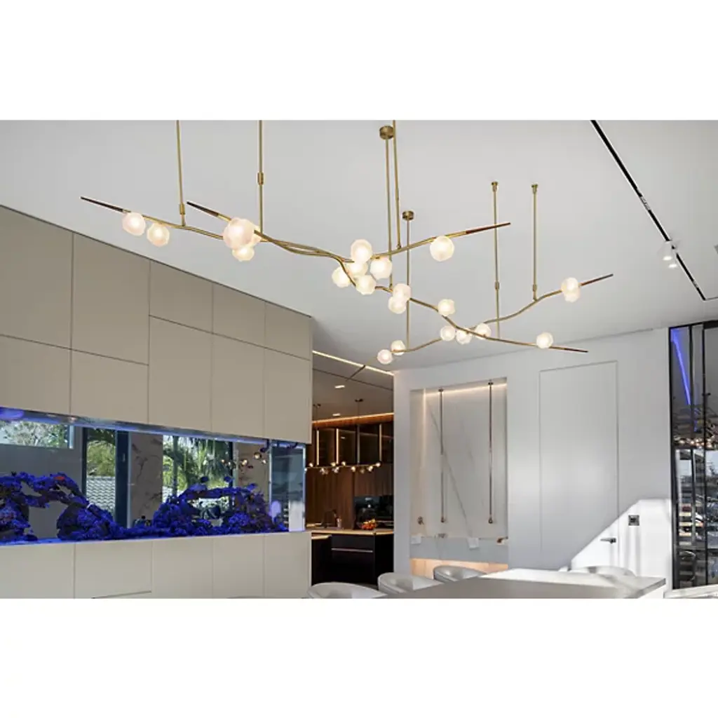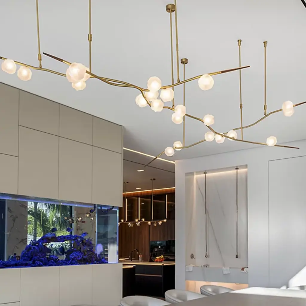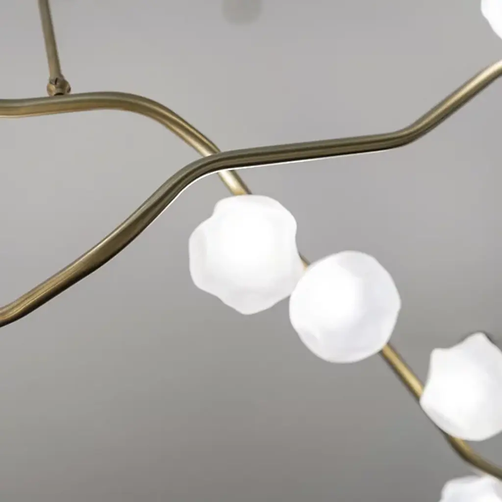 Elevate your space with the dynamic design of the Ivy Branch Configurable Multi-Lights & Systems from Shakuff. A richly textured, completely customizable creation made in the USA, this fixture blends contemporary simplicity with artistic charm. Its circular canopies extend slender downrods to twisting metal stems reminiscent of climbing vines, contrasting smooth suspension structures with clever curves. Wooden ferrules tipping each curling vine add natural warmth, while hand-blown glass shades, each with distinctive crumpled textures, enhance its organic, luminous beauty.