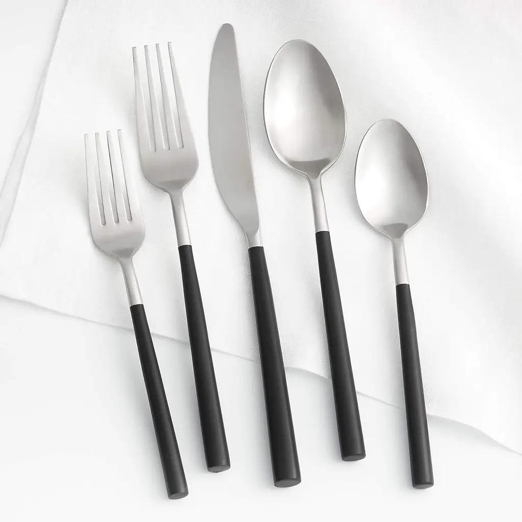 Satin-finish stainless steel meets matte black plastic in this mod flatware set. The round, slender handles perfectly complement the silky, streamlined heads in a set that's both playful and polished. Each of the four 5-piece place settings includes a dinner fork, salad fork, dinner spoon, teaspoon and dinner knife.