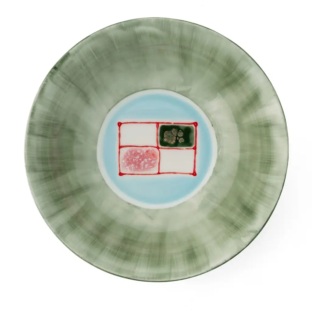 The Jade Large Salad Bowl features soft pastel green hues paired with striking geometric patterns, creating a harmonious blend of softness and strength. Its contemporary design adds a vibrant touch to any table setting, perfect for serving salads or fruit displays.