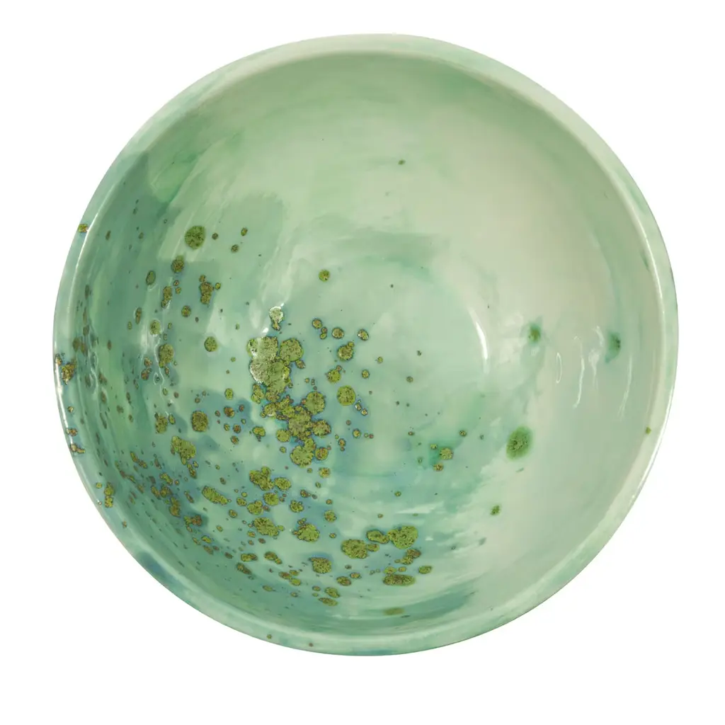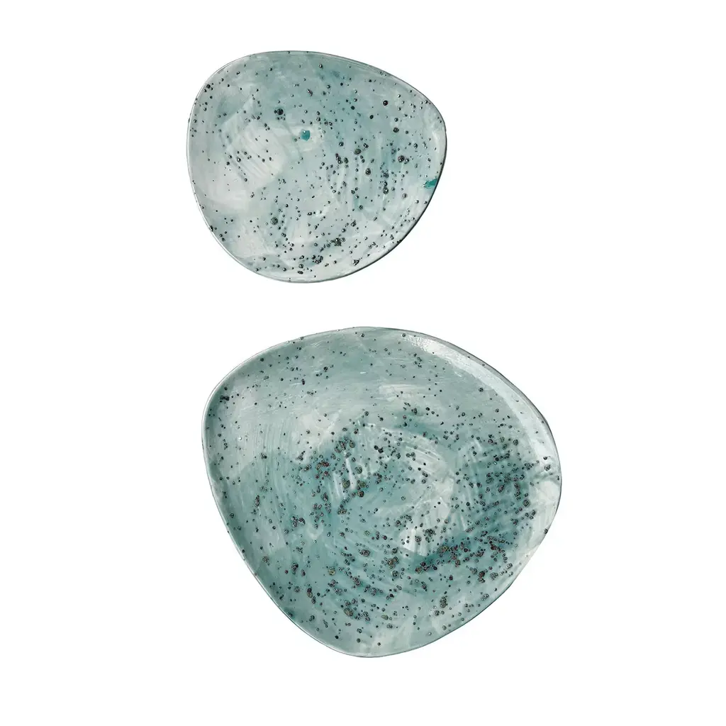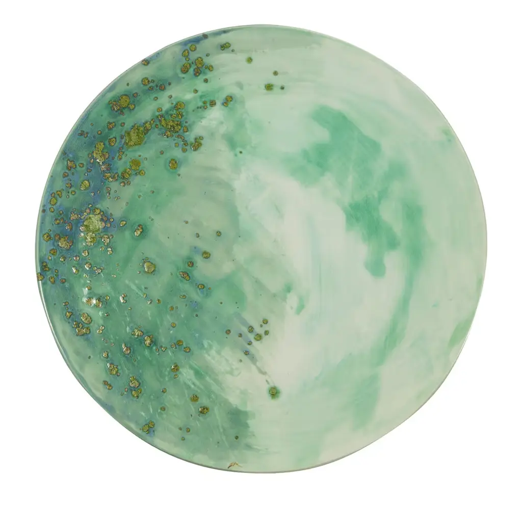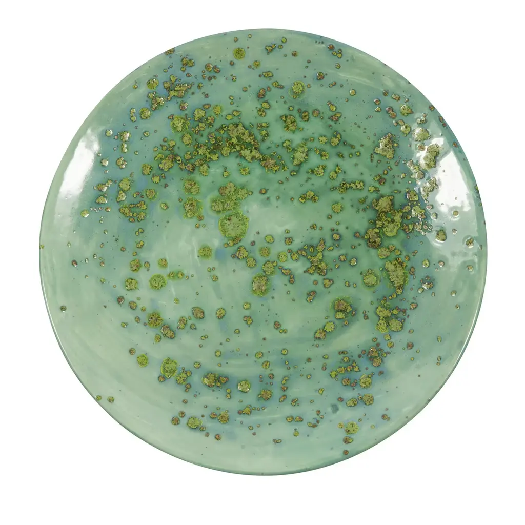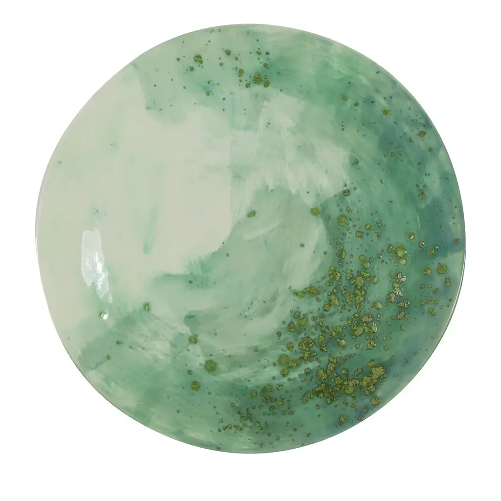 This striking set of ceramic plates is characterized by vivid green irregular spots adorning the delicate pale green shade of their satin-finished surfaces. The product of artisanal mastery, these plates are all hand-painted, which makes each piece a one-of-a-kind object that can slightly vary in appearance from the photo. The set includes one flat dish, one soup plate, one fruit bowl, and one serving dish that can also be used as platter, all colored using non-toxic materials.