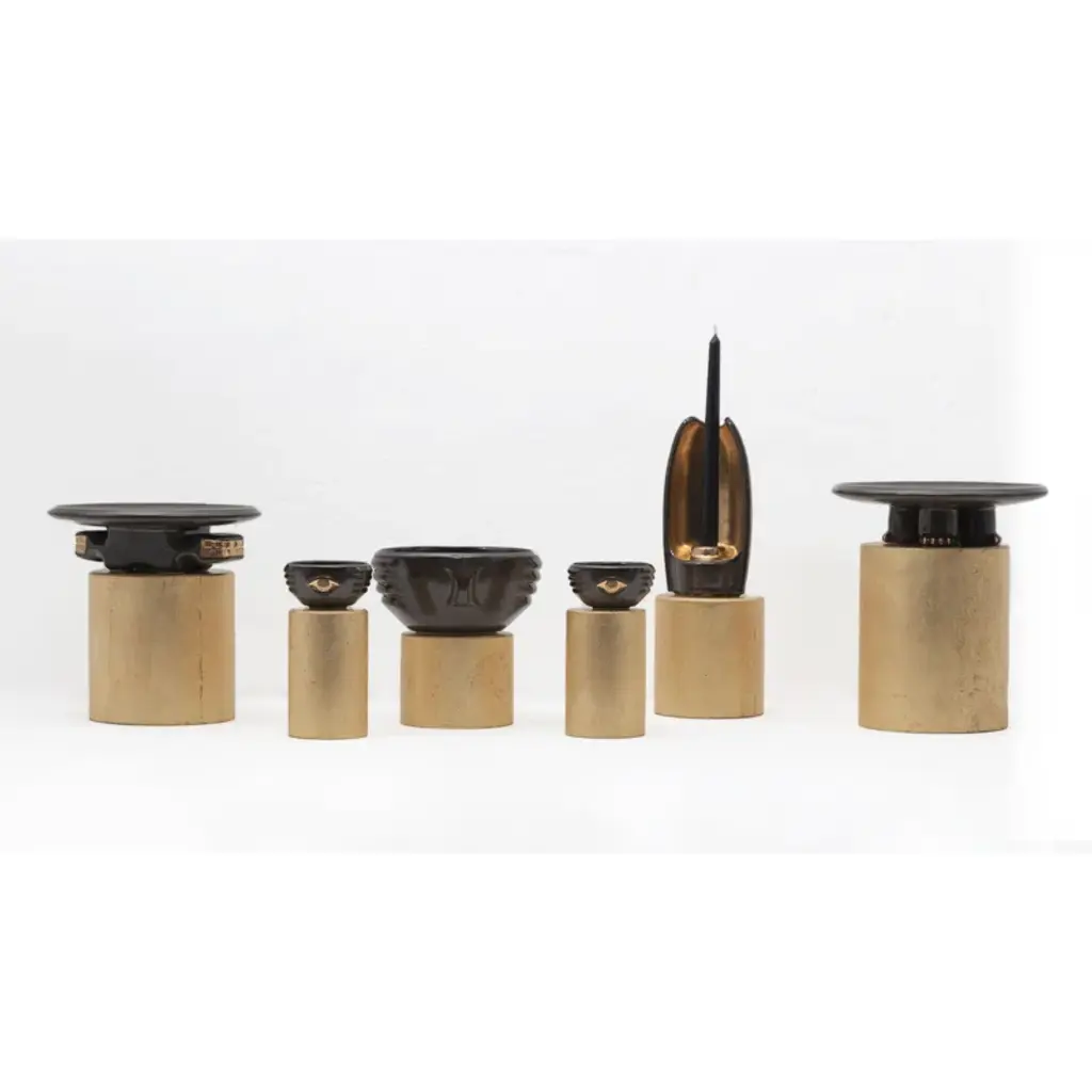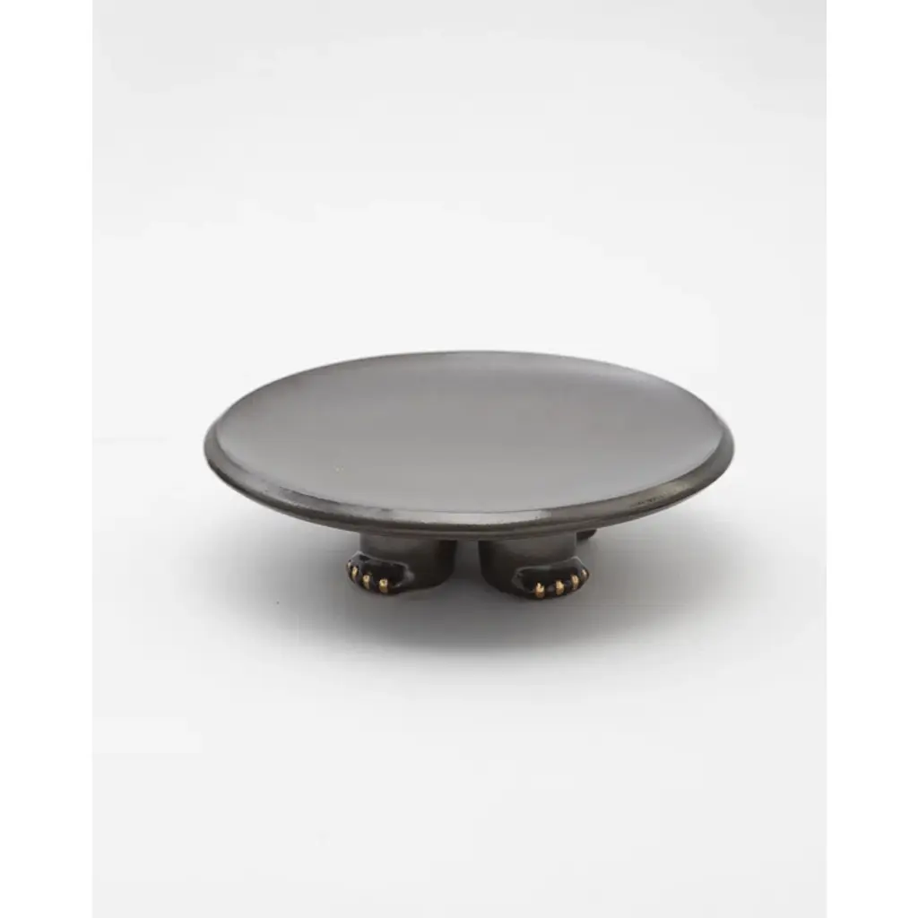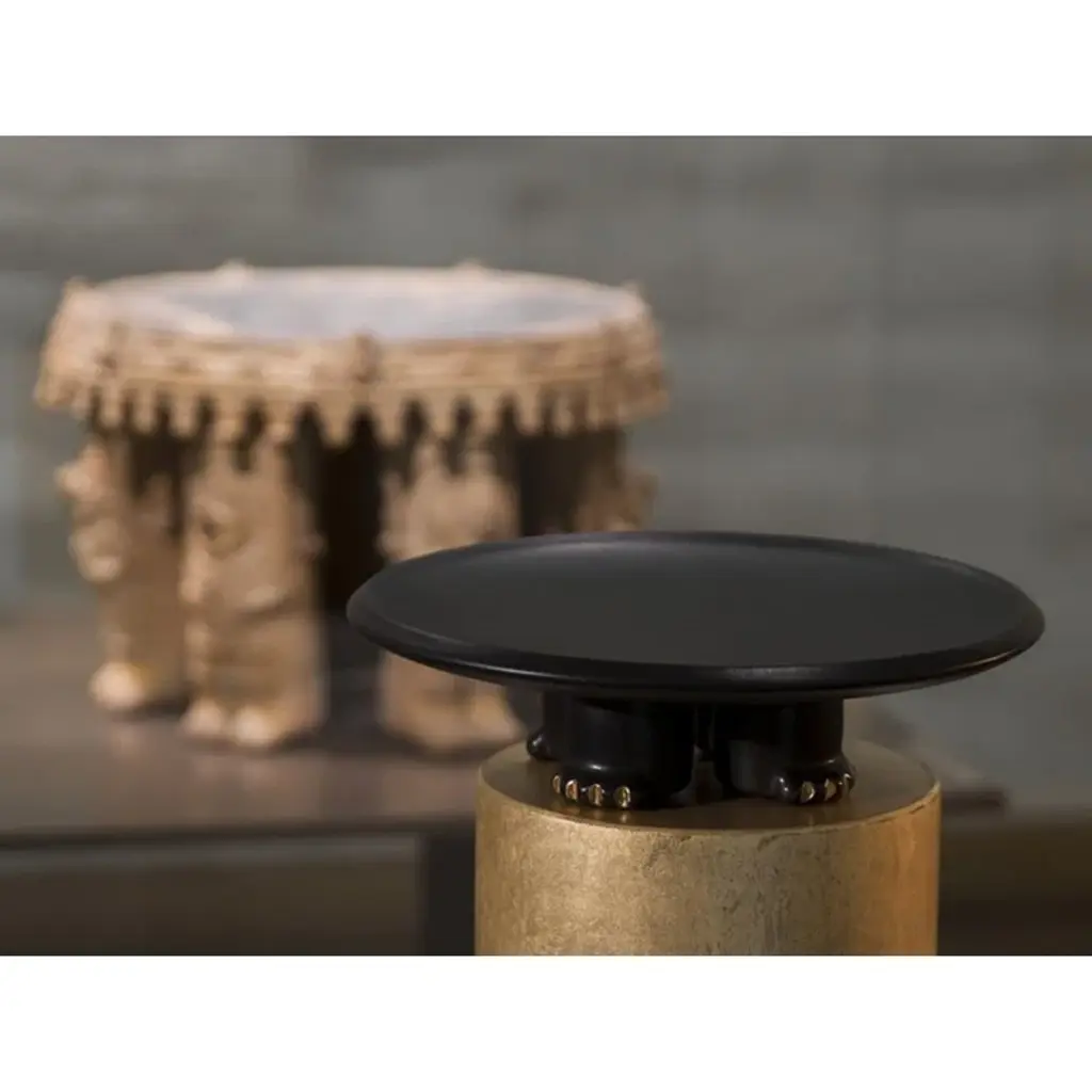 Decorative slip casted ceramic platter finished with a rich black or dark green glaze, highlighted with gold luster details.