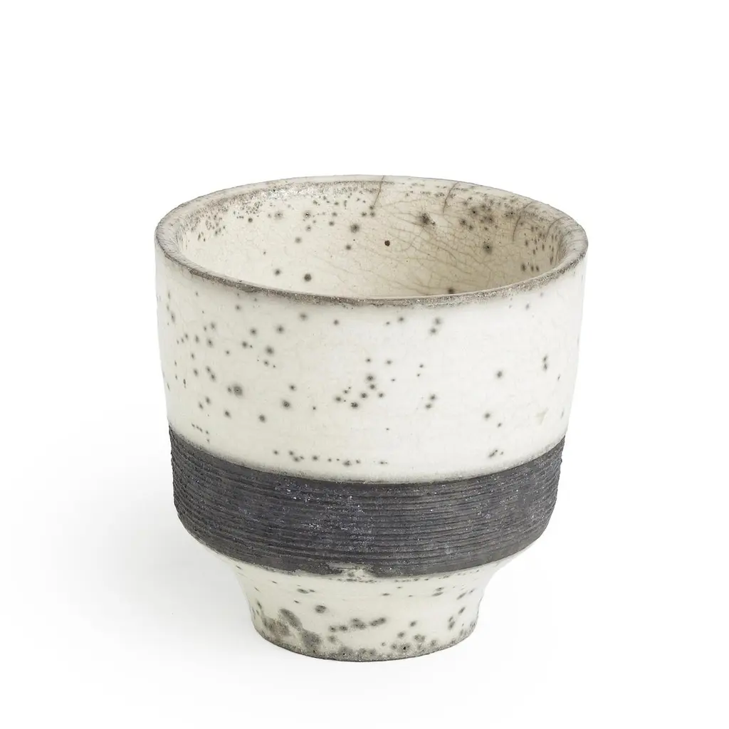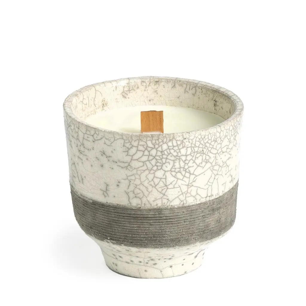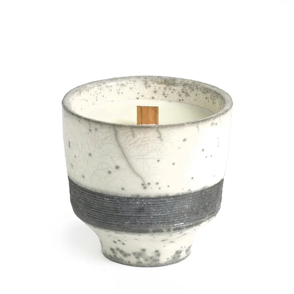 Komerobi, in Japanese, means: " the sunlight that passes through the leaves of the trees ". This cup by its extremely clean design is a reminder of the zen essentiality and the use of the cup for its most sacred purpose during ceremonies. Featuring a wooden wick, that enables the flame to expand itself also horizontally and with a sound reminding the crackle of the fire. Citrus top notes mixed with Ginger, Almond, and Spices heart notes give this fragrance an irresistible appeal. A black burnt Raku band and its raku crackle effect define this cup design.Scented Wax:Top Notes: Orange, Mandarin, LemonHeart Notes: Ginger, Coffee, Almond, PepperBase Notes: Vanilla, Cinnamon, ClovesDiameter (cm) 10 x h 9.5Filled with 300 ml of Scented Nectar WaxHandmade in Italy.