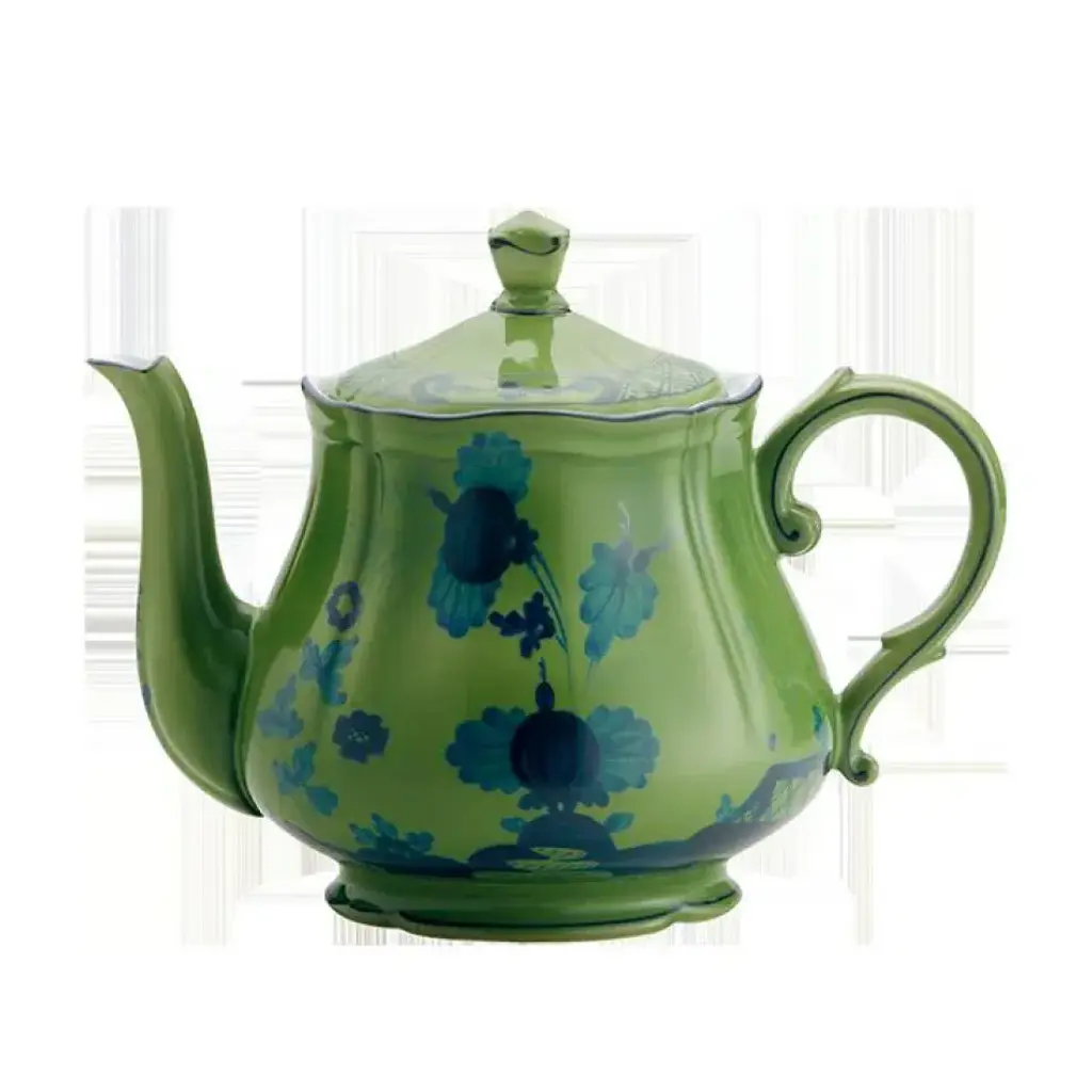 Adapted from botanical drawings of gardens in Mumbai, India, where an abundance of rare plant species grow, precisely detailed floral and vegetal illustrations adorn this fine porcelain teapot from Bernardaud. It's edged with a rattan trompe l'oeil pattern reminiscent of popular Indian furniture designs.