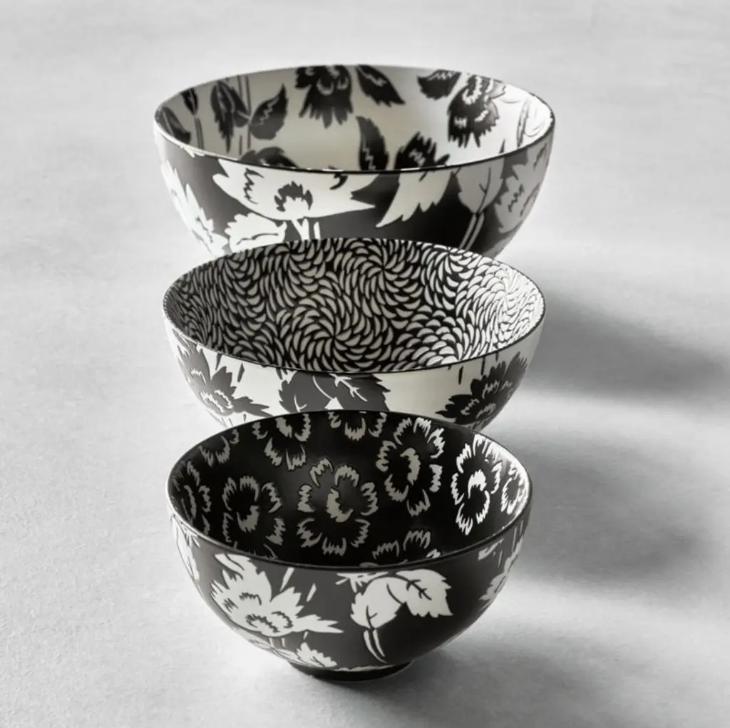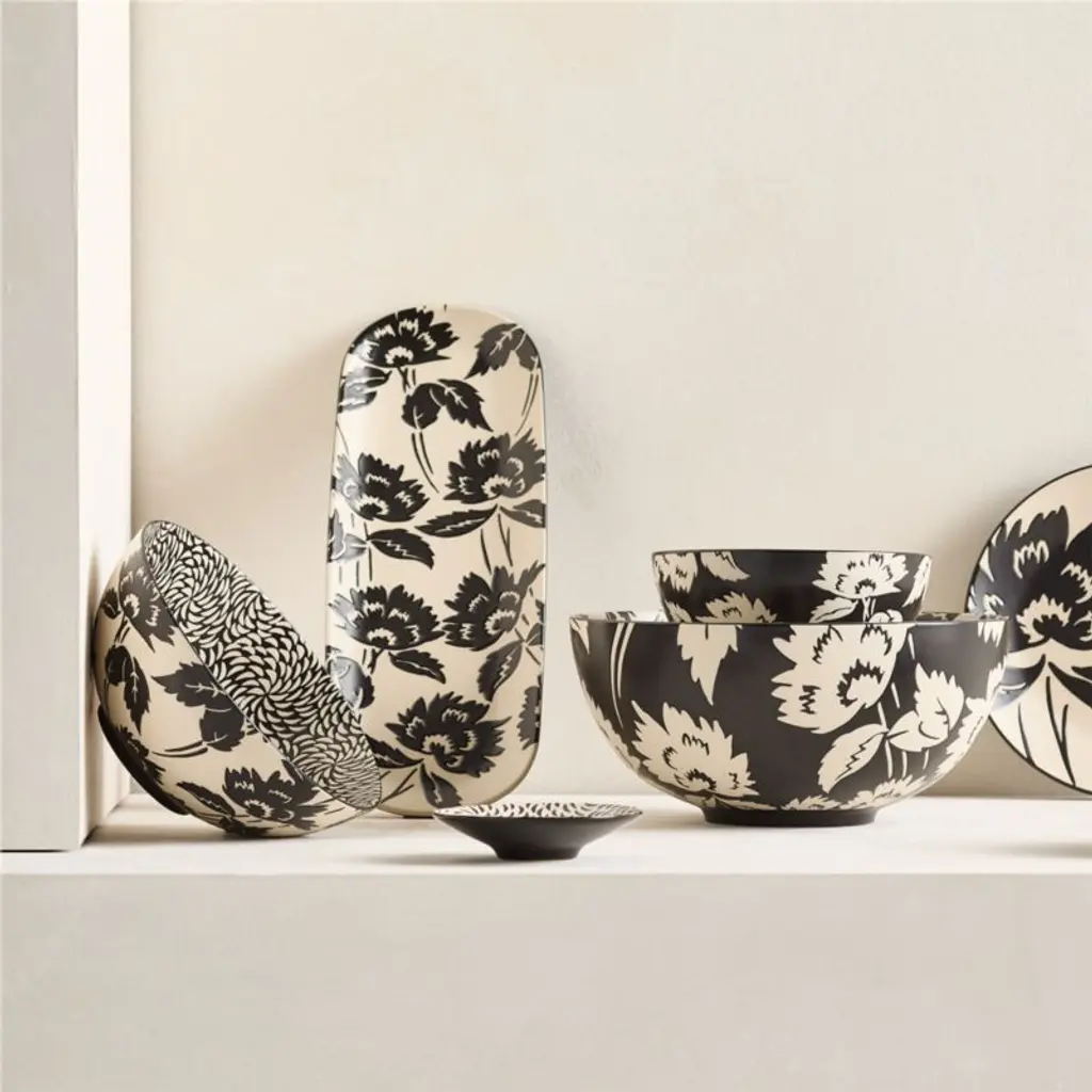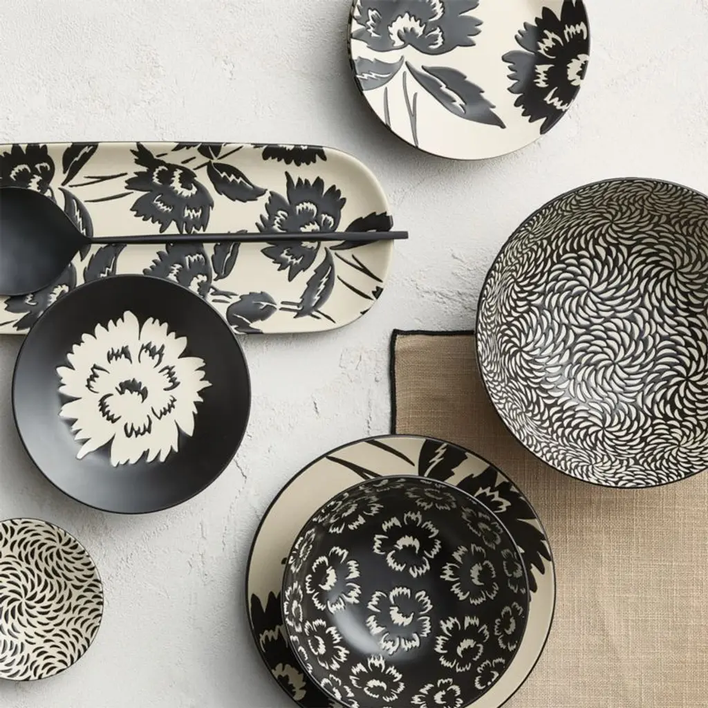 Inspired by vintage Asian botanical patterns, our Jardin serving collection is embellished with stylized florals that look elegant and modern. The serving bowl is decorated inside and out with stems in full bloom, glazed in black-and-white with a wax-resist technique that lends subtle texture as well as durability. The bowl pairs beautifully with our Jardin platter, salad plates, dip bowls and other-size serving bowls.