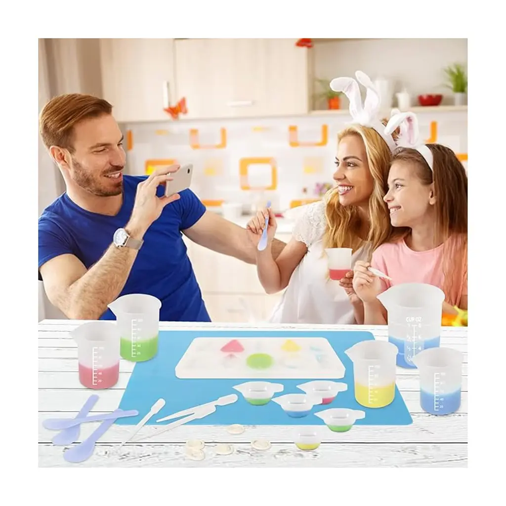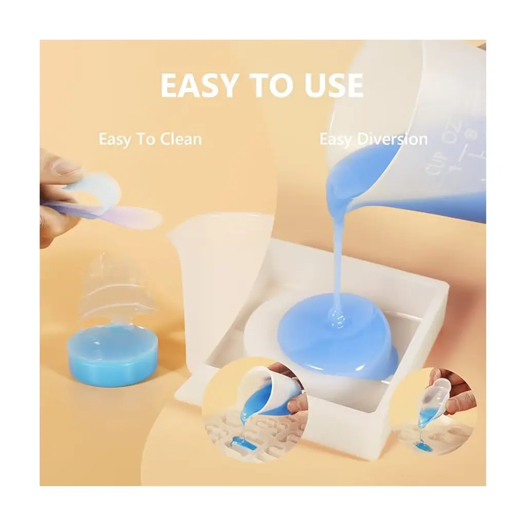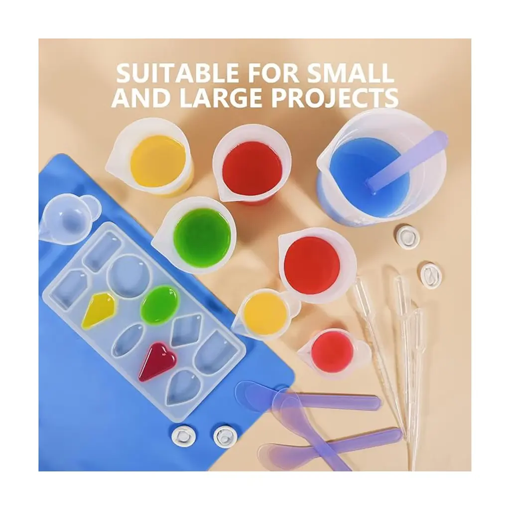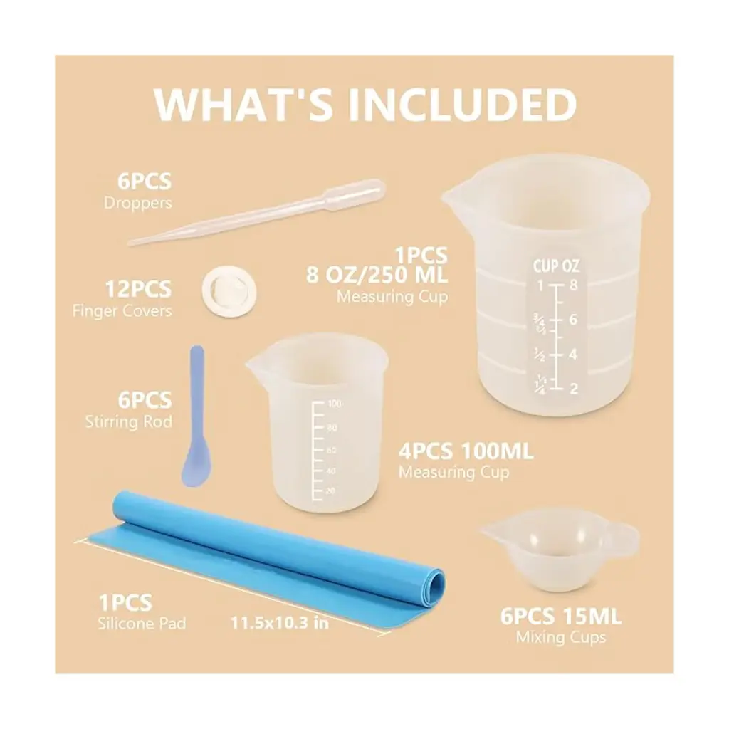 【Resin Mixing Kit】:Includes 1x 250ml silicone measuring cup, 4x 100ml silicone measuring cups, 6x stirring sticks, 6x silicone cups, 1x silicone pad, 6x droppers, 12x finger covers. Providing you with more silicone containers and a more comprehensive set of silicone tools.【Easy to Clean】:The entire tool set is made of silicone with a smooth, easy-to-clean surface. After the resin is cured, it can be easily peeled and cleaned, and reused many times.【Easy to Use】:The kit provides more measuring cups for mixing more resin. It also provides more measuring cups for multiple color mixing, and smaller cups for better finishing.【Wide Range of Applications】:The tool is made of high quality silicone, with infusion port design and graduated lines. Kits are suitable for mixing resin, DIY craft work, paint mixing and other liquid work.【100% Service】:We not only provide you with quality products, but also answer any questions you may have 24 hours a day and are happy to serve you.