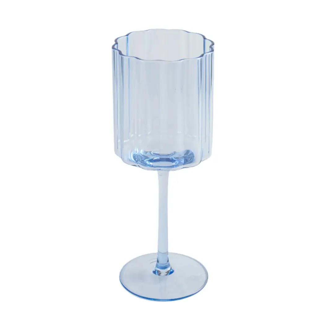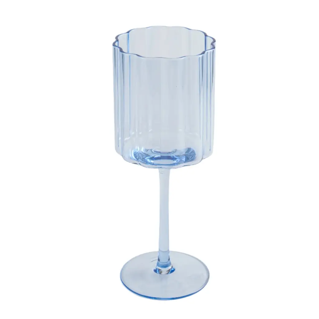 Experience wine in a whole new light with our beautiful light blue wine glass. This stunning glassware combines classic design elements with a beautiful touch of blue and a delicate scalloped rim creating a vessel that is both sophisticated and whimsical—a must-have for wine enthusiasts who appreciate style and enjoyment. Sold as a set of 4. 3.1" dia x 8"H, 12oz capacity