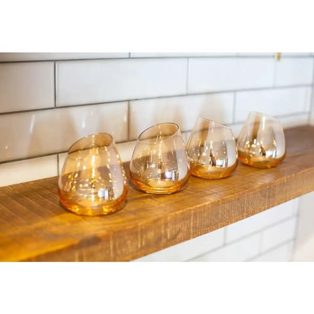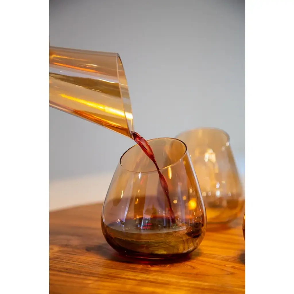Crafted from premium quality glass with a luxurious gold finish, this set includes 4 stemless wine glasses and a matching wine decanter. The glasses are designed with a sleek and modern look, featuring a slanted edge that will elevate your wine-drinking experience. The matching wine decanter is designed with a classic yet modern shape that will impress your guests and enhance the flavor of your wine. The decanter is carefully crafted to aerate your wine, allowing it to breathe and reach its full potential.