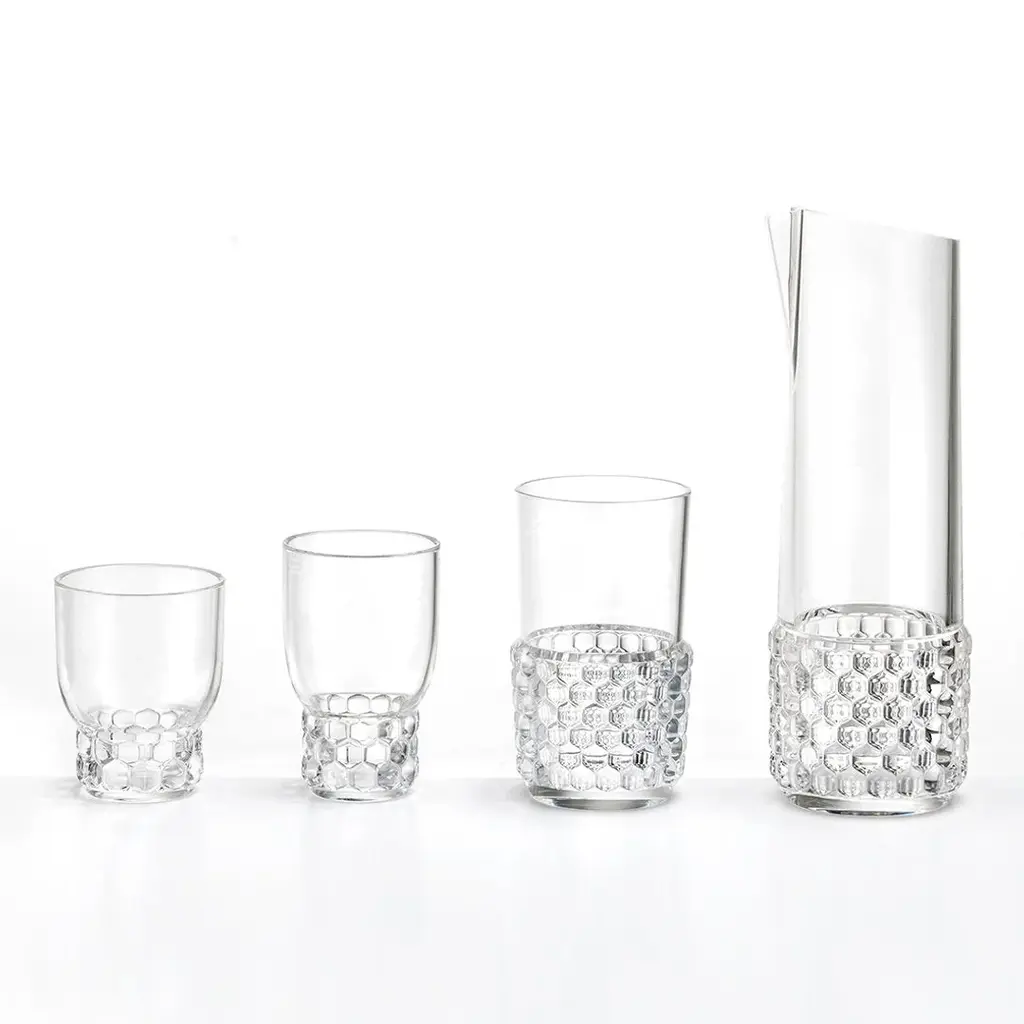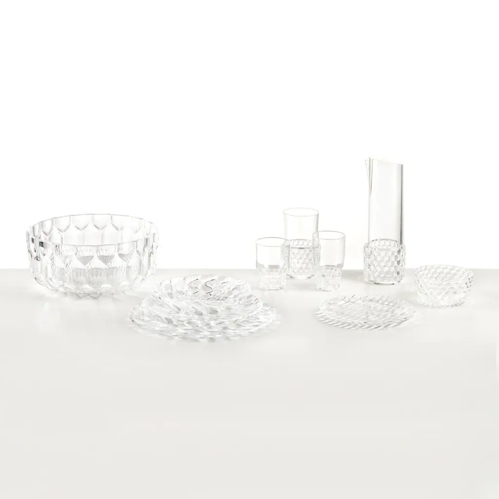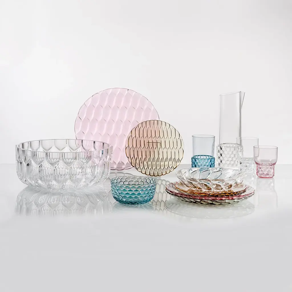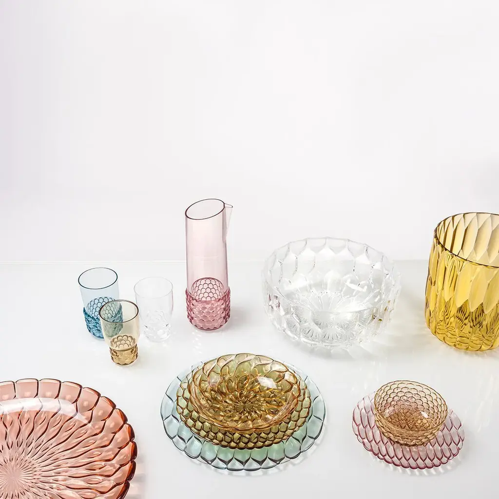 A comprehensive line of plates, trays, glasses, bowls and carafes made from colourful and transparent PMMA plastic. The line's individuality is down to the fact that each model presents a different organic pattern that has clearly been inspired by nature, harking back to the moulds that were once used for making jellies. This design highlights temporality, and therefore also variety, from smallest to largest. The faint, delicate and accessible transparent colours are suitable for furnishing any kind of table: creative and original, or more classic and monochrome.