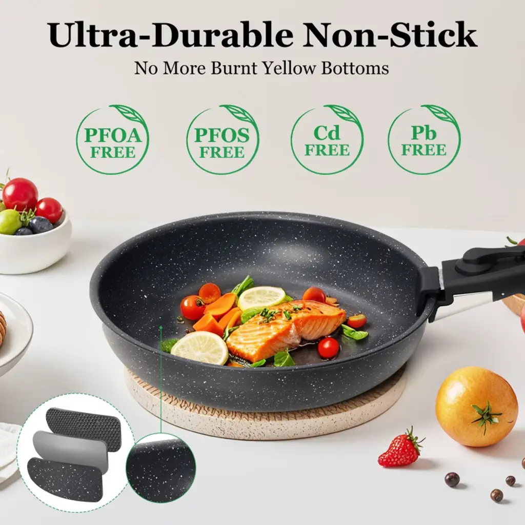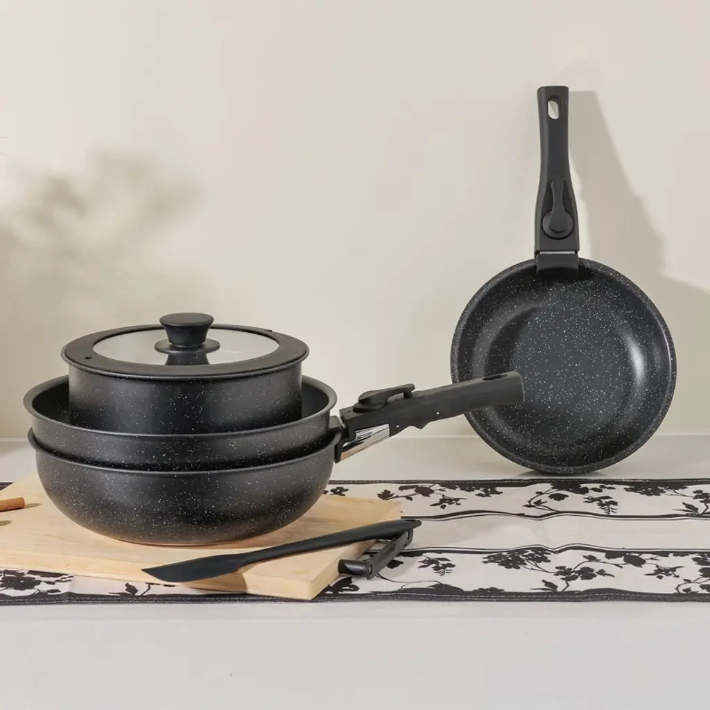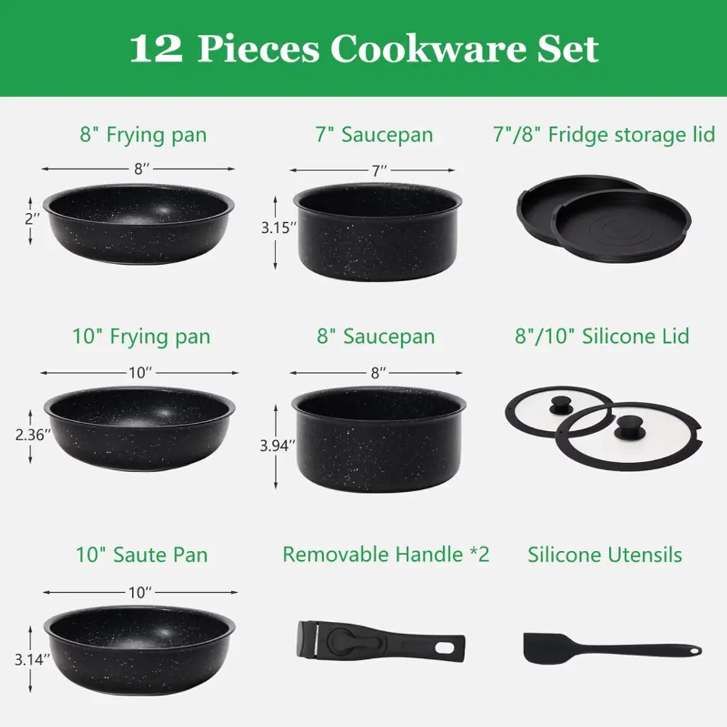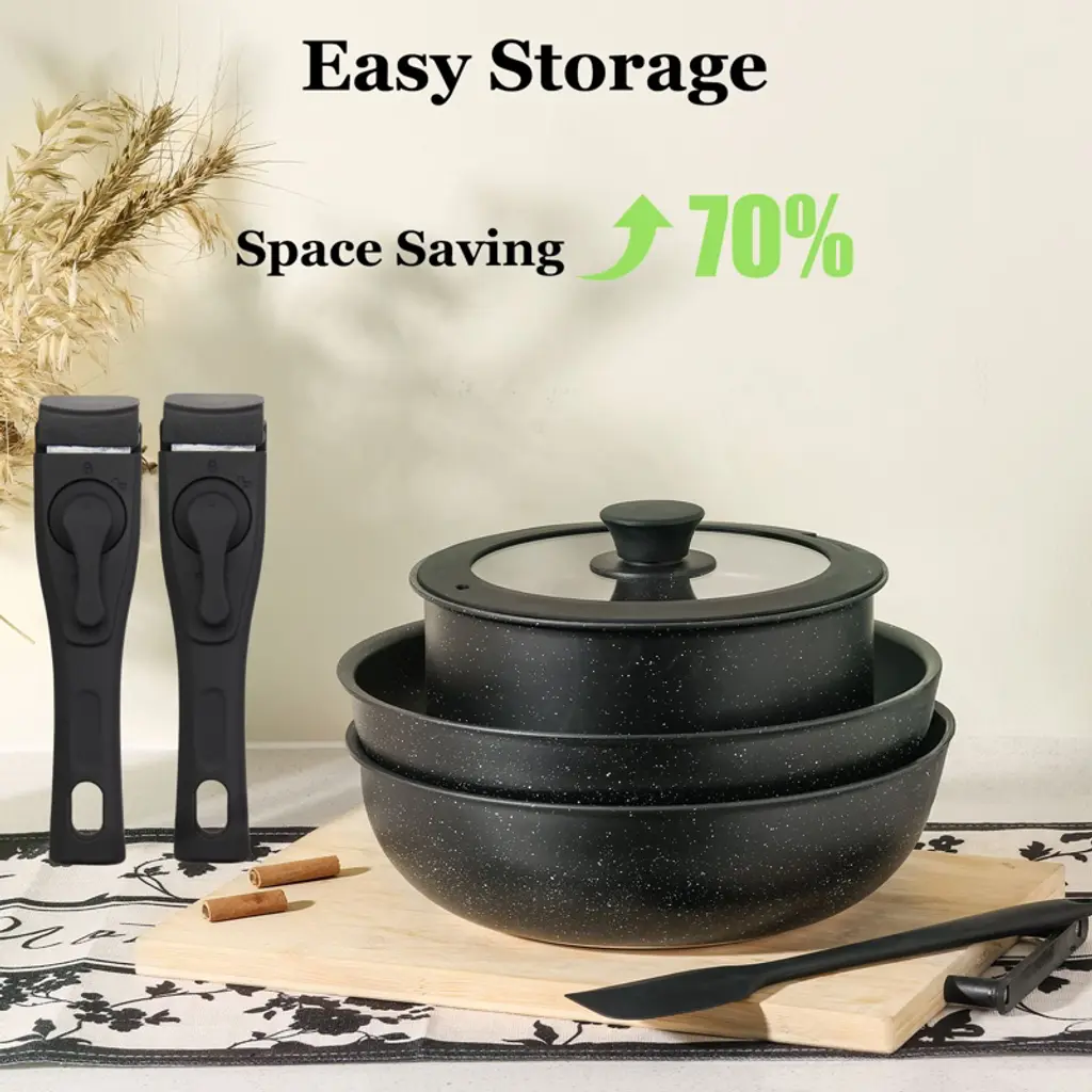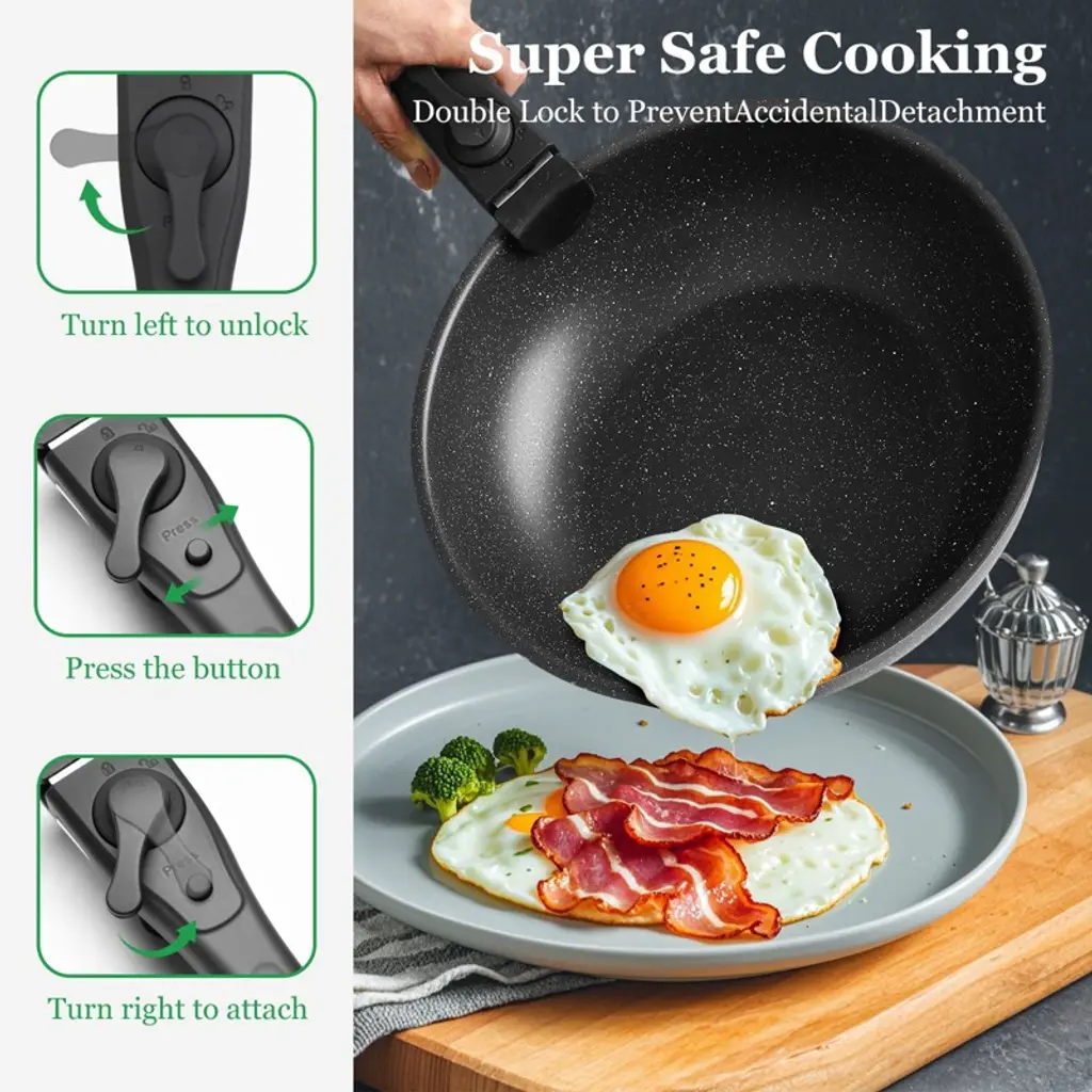 Our nonstick pots and pans set is the ultimate comprehensive cooking solution for your kitchen. Comprising 12 carefully designed pieces, this set caters to every aspect of your daily culinary adventures. Whether you're whipping up a quick Stir fry - fry with its intense heat and rapid cooking requirements, indulging in the art of Western baking with precise temperature control, or slowly steaming and stewing your favorite dishes to perfection, these kitchen tools have got you covered. The non - stick pan design is a game - changer. Employing advanced non - stick coating technology, it guarantees that your food won't stick to the bottom during the cooking process. This not only makes cooking a breeze but also reduces the amount of oil needed, making your meals healthier without sacrificing flavor. And when it's time to clean up, the non - stick feature really shines, allowing you to simply wipe away any residue with ease. The removable handle is a unique and highly practical feature. It's not just about convenience; it's about transforming your cooking experience. By being able to detach the handle, storage becomes a cinch, saving valuable space in your kitchen. But that's not all. This design allows for multi - purpose use of each pot, adapting effortlessly to different cooking scenarios and stove types, be it an induction cooktop or a traditional one.