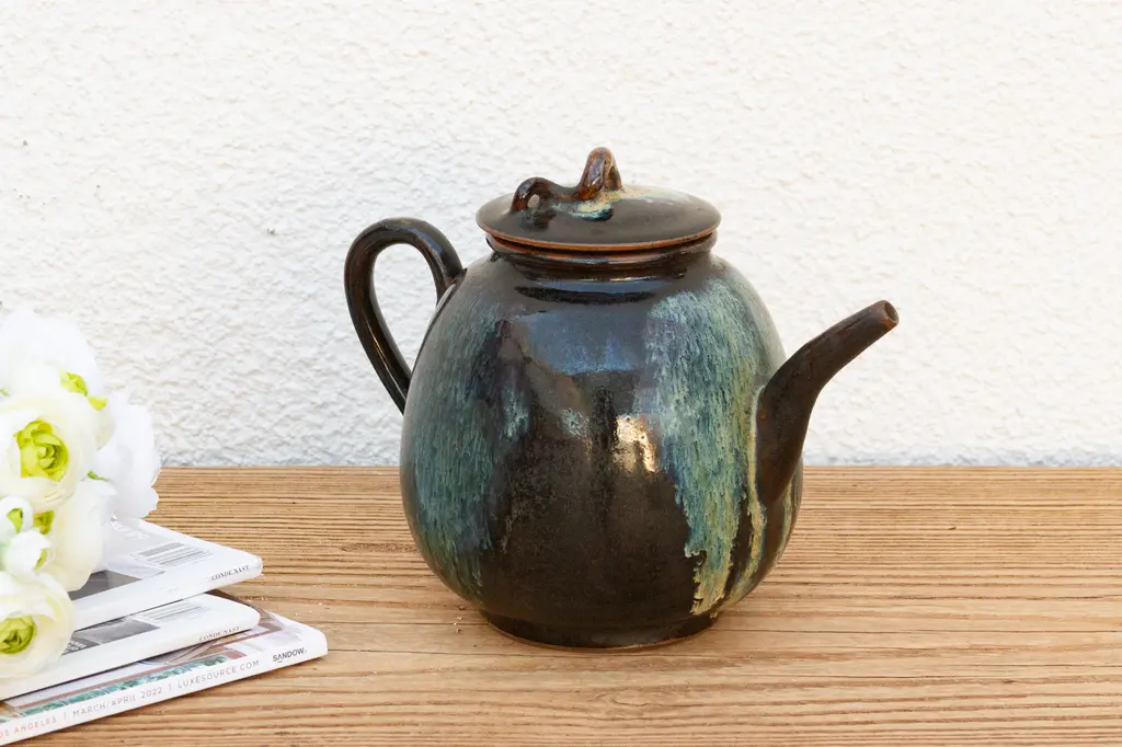 A timeless piece of Chinese pottery, this vintage Jizhou porcelain pot features a dark glaze with soft blue streaks. The original lid adds to its authenticity and visual appeal. This Song Dynasty style tea pot is a beautiful decorative centerpiece. The elegant dark glaze and create a unique and aged aesthetic. Add a touch of vintage elegance to your home with this exceptional decorative pot.
