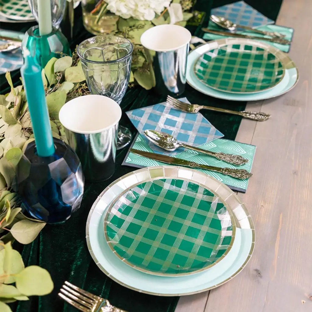 The Le Moderne Collection by Jollity & Co is filled with deep hues of green, blue, and silver foil details. A guest napkin, dinner plate, dessert plate, and cocktail napkin complete this beautiful collection. Package contains 8 paper plates Each plate measures approximately 7 inches in diameter Not safe for microwave use