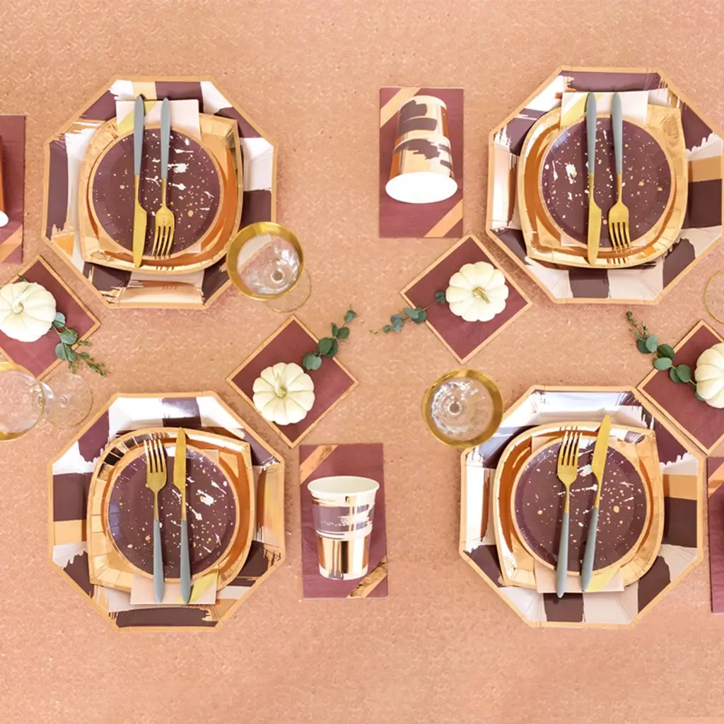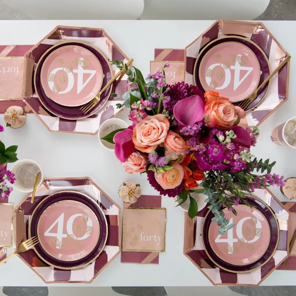Beautiful and versatile, the Jollity & Co Mauve-elous collection is created to bring stylish one-time use party goods to the most elegant of occasions. Inspired by the beauty that is created in art, the collection features a mix of brushstroke and paint splatter elements with a two tone mauve color palate and rose gold finishes. Package contains 8 paper platesEach plate measures approximately 14 inches from corner to cornerNot safe for microwave use