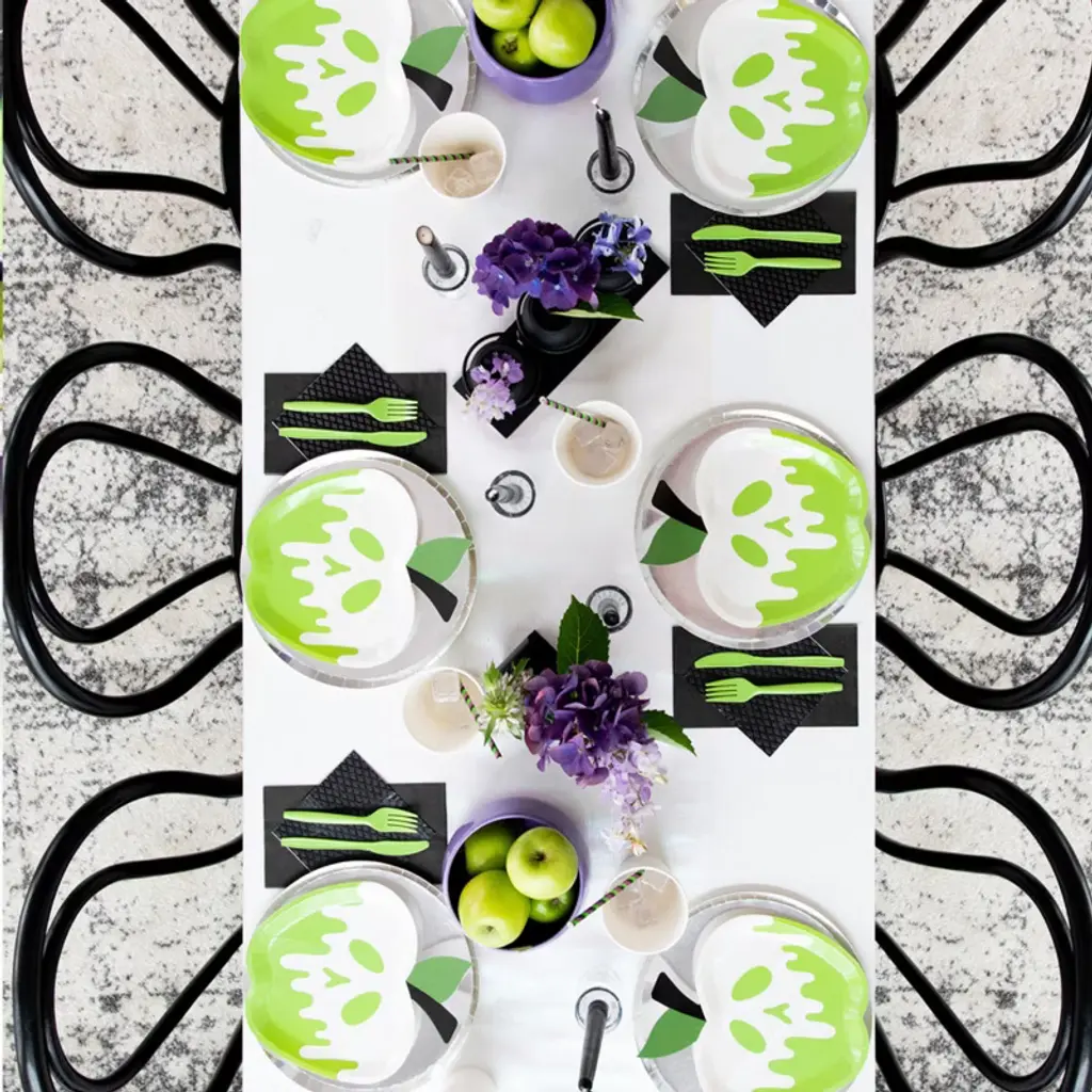 Serve up something wicked with these Poison Apple Paper Plates! Featuring a bright green apple with a spooky white drip and eerie skull face, these plates are perfect for Halloween parties, villain-themed birthdays, or any event that needs a little playful fright. Made from sturdy paper, they’re both fun and functional—perfect for holding all your favorite treats and snacks. Die-Cut Paper Dinner PlatesPack of 8Approx. 8.5"Holographic foil detailsNot safe for microwave use