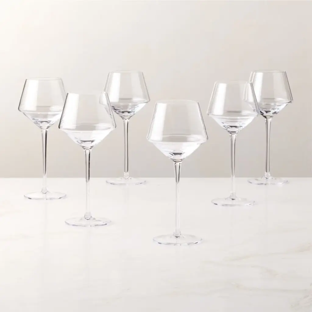 Handcrafted white wine glasses sip from all the right angles. Straight sides taper sharply for a dramatic bowl that sits pretty atop a thin, elongated stem. CB2 exclusive.