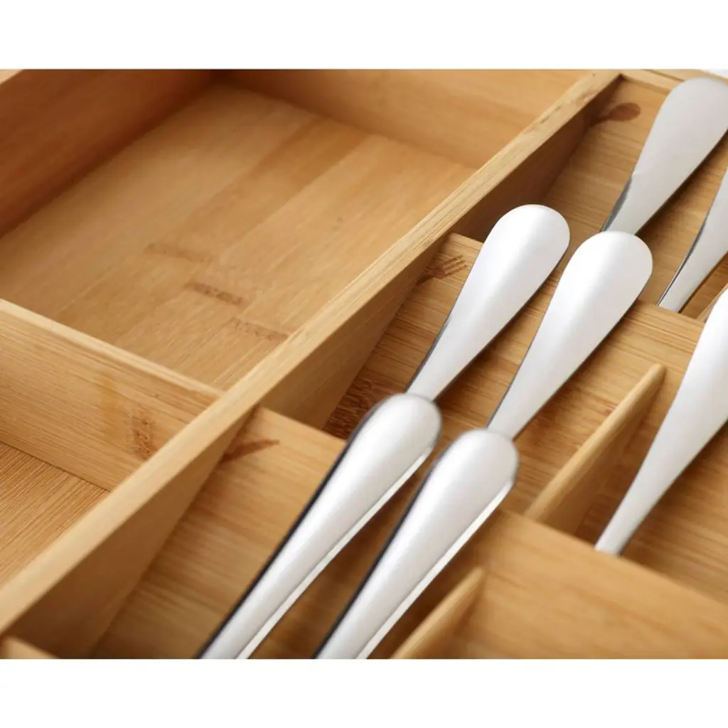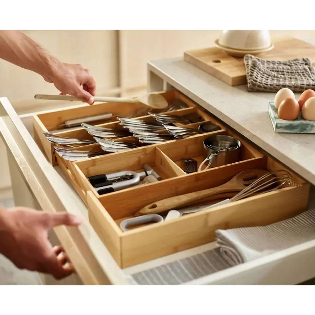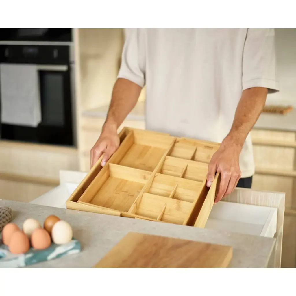 Organize messy cutlery and utensil drawers with this smart storage solution. The unique design features five overlapping compartments for storing cutlery and two deep-sided compartments for holding small gadgets, such as can openers and peelers. Both sides of the tray can be expanded to create even more storage space for larger utensils. What’s usually stored in two drawers can now be neatly organized into one, creating more space in your kitchen. Made from beautiful, natural bamboo and suitable for drawers with a minimum height of 3.25 inches.
