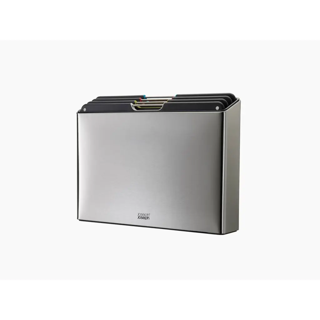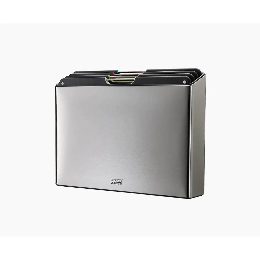 Keep all your chopping board needs beautifully organized with this sleek design. It features a slimline storage case containing four, large color-coded boards each with knife-friendly, textured cutting surfaces on both sides and non-slip feet. The boards themselves can be easily removed from the case due to the smart angled design and their stainless-steel selecting bars. The case holds each board neatly apart, allowing air to circulate, and has non-slip feet on the base. Available in a range of sizes and case colors.