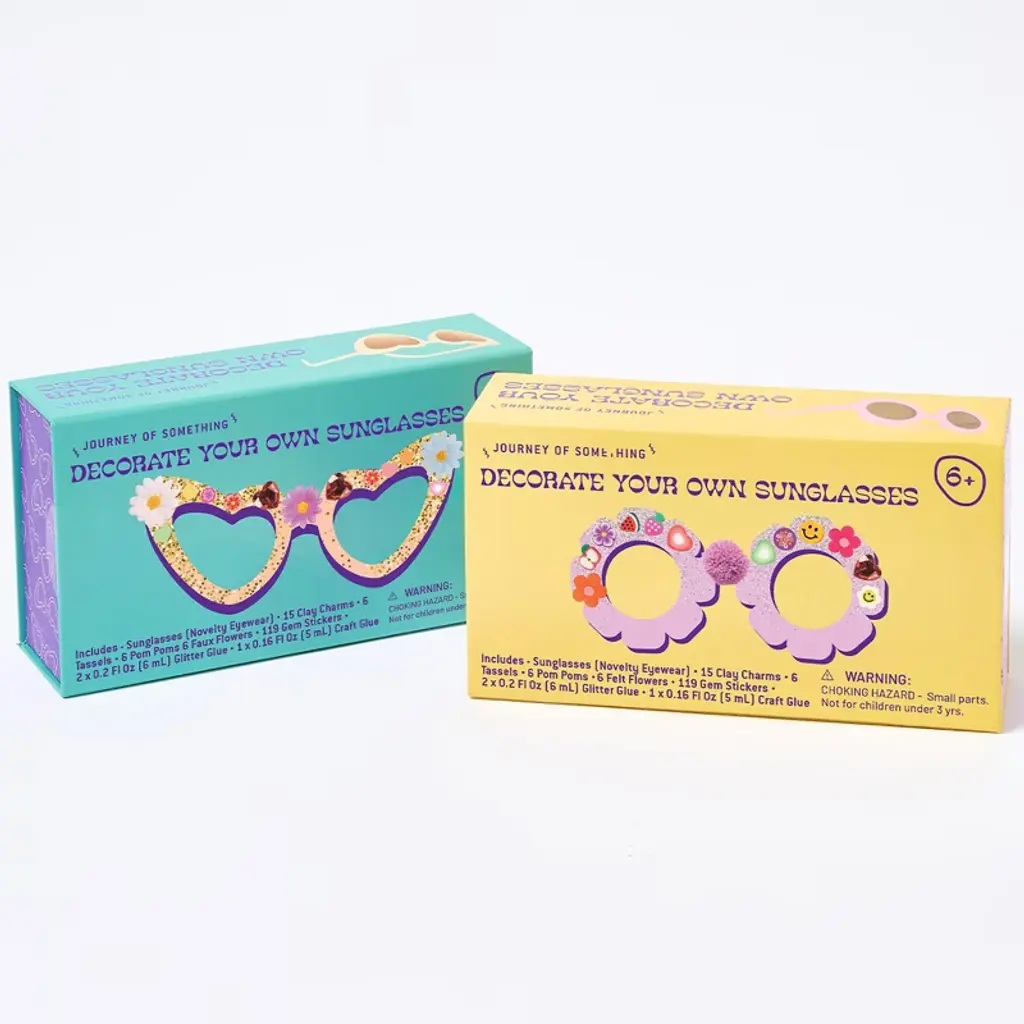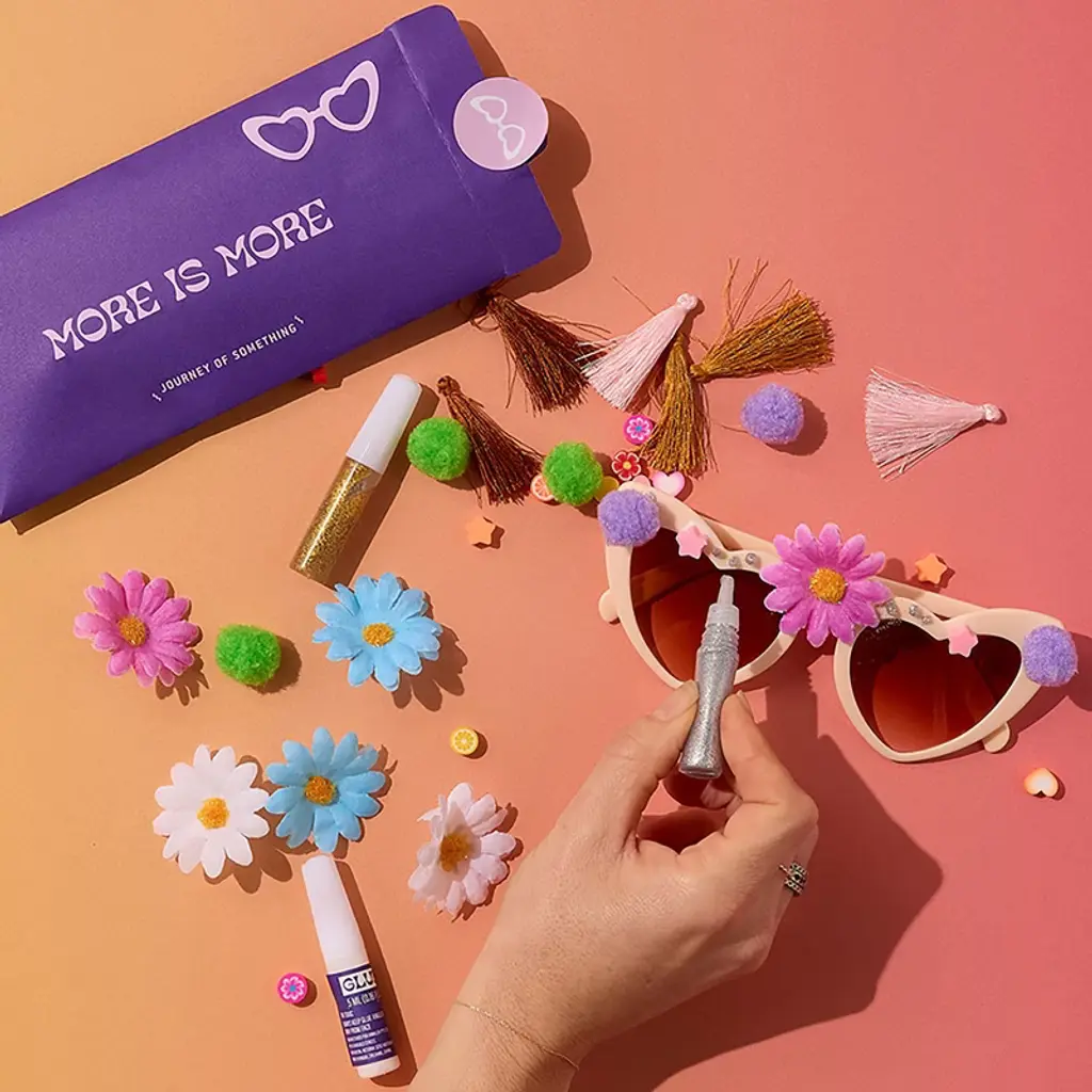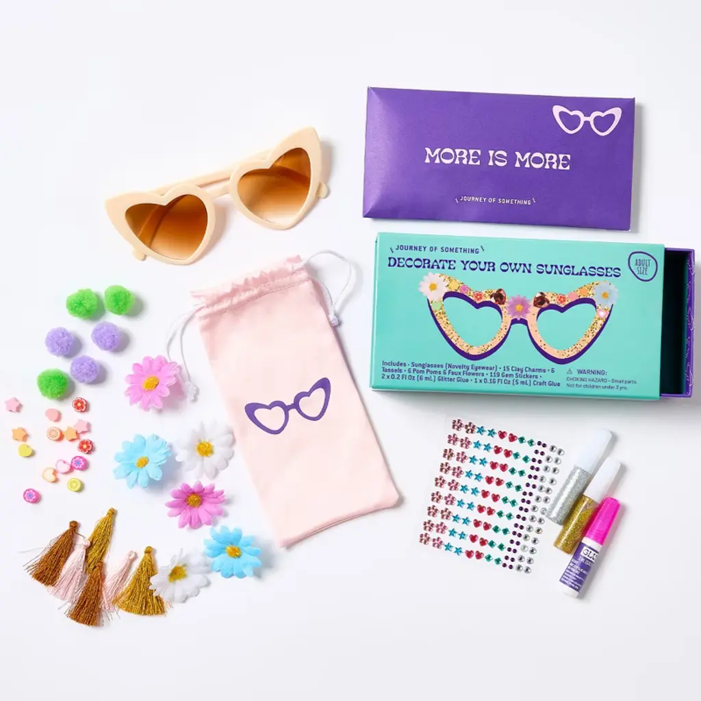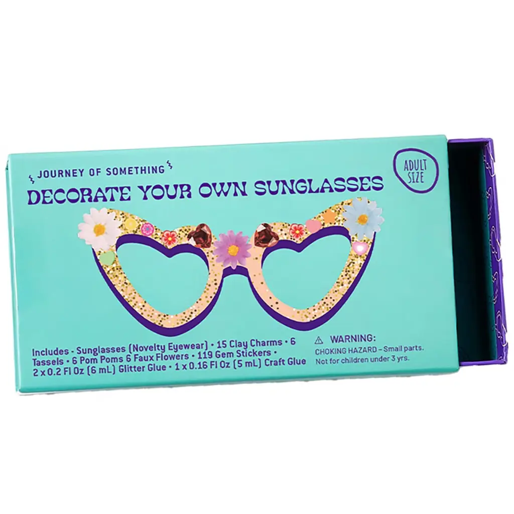 JOURNEY OF SOMETHING: DECORATE YOUR OWN HEART SUNGLASSES KIT - Express your creativity and personal style with the Decorate Your Own Heart Sunglasses Kit, a glamorous craft set perfect for creating bold and eye-catching accessories! Using charming embellishments like clay charms, glitter glues, and sparkling gem stickers, you can transform plain heart-shaped glasses into a one-of-a-kind fashion piece. Perfect for parties, bachelorette nights, festivals, or just a fun DIY project. With everything included, designing a personalized masterpiece has never been easier. WHAT’S INCLUDED: 1 Heart-Shaped Sunglasses - A fun frame to decorate. 15 Clay Charms - Unique embellishments for a custom touch. 2 Glitter Glues - Add a sparkling finish. 1 PVA Glue - Securely attach decorations. 6 Pom Poms and 6 Tassels - Fun and playful accents. 50+ Gem Stickers - Make your glasses shine. 6 Faux Flowers - A stylish, whimsical touch. 1 Drawstring Glasses Bag - Store and protect your creation. WHY YOU’LL LOVE IT: Perfect for Parties and Events - Great for bachelorette parties, festivals, and birthdays. A Fun and Stylish DIY Activity - Create unique accessories to match your style. Pairs with the Kids' Kit for Family Fun - A fantastic mommy-and-me crafting experience. Designed for Creativity and Self-Expression - A great way to personalize fashion accessories. NOTE: Stylish accessory only - not designed for sun protection.