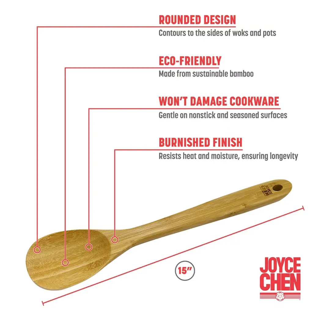 Joyce Chen was passionate about cooking healthy and delicious meals, and making Asian cooking accessible to every household; forever enriching the cuisine, culture, and curiosity of culinary experts and enthusiasts alike. JOYCE CHEN® Kitchenware is inspired by her legacy and offers a complete range of products that help you craft authentic Asian dishes in your own kitchen and bring delicious new flavors to your table. The Joyce Chen 15-inch Burnished Bamboo Mixing Spoon is the perfect addition to any kitchen. This durable spoon can handle hot oils and soups without scratching nonstick or seasoned surfaces. The design of the spoon allows you to get every last bit from the rounded sides of the wok or properly mix all baking ingredients in a bowl. Made with sustainable, renewable bamboo, this eco-friendly spoon has a burnished finish that resists heat and moisture. At 15 inches long, this spoon is the perfect in-between size for a variety of uses in the kitchen. It's not too long that it becomes unwieldy and not too short that it can't reach the bottom of deeper pots. The Joyce Chen 15-inch Burnished Bamboo Mixing Spoon is a reliable, eco-friendly, and stylish utensil that will quickly become your go-to in the kitchen.