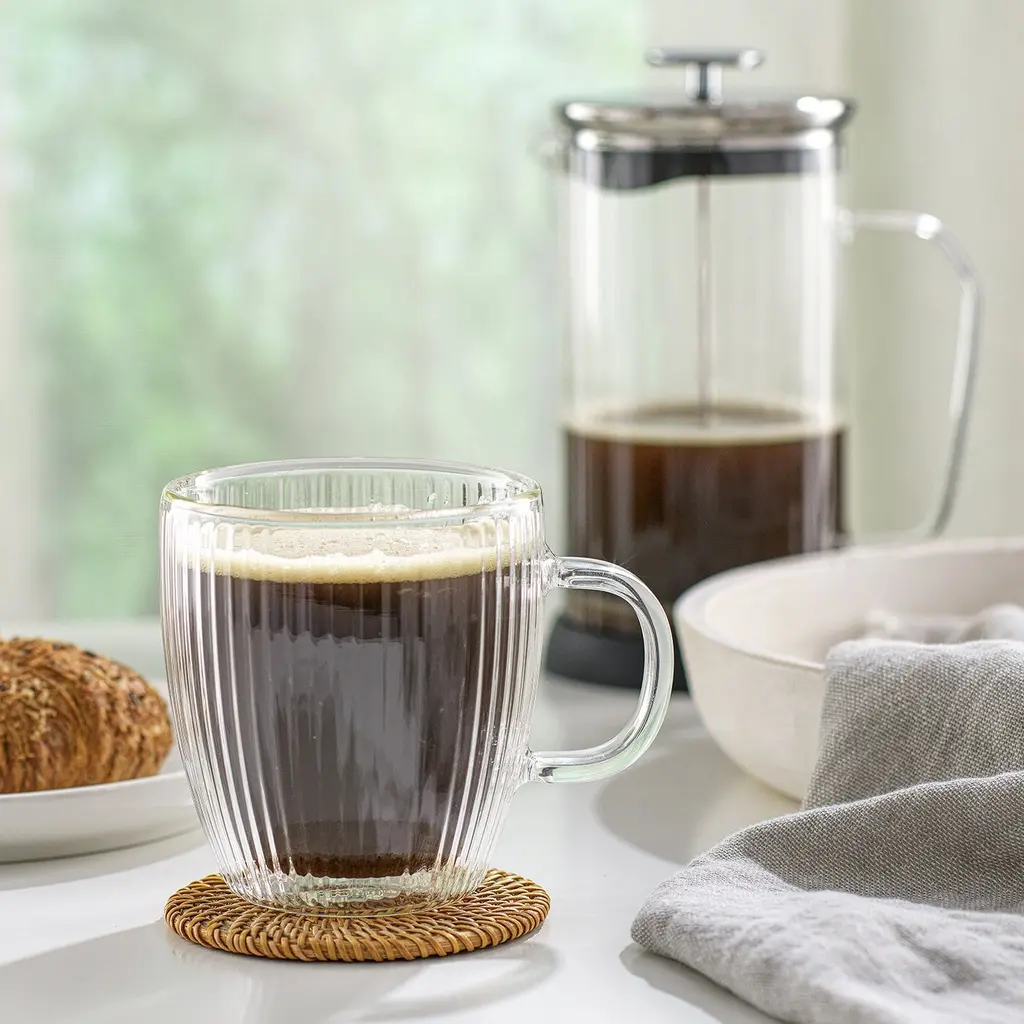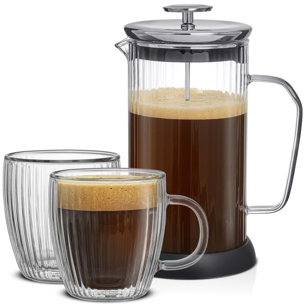 Joyjolt Fluted Coffee French Press & 2 Fluted 13.5 Oz Double Walled Coffee Mugs Set - Clear