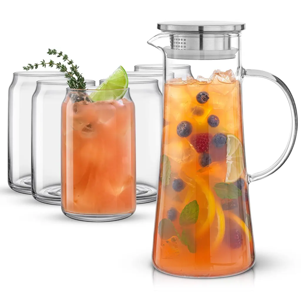 Want the perfect holiday gift or housewarming gift? Everyone needs a good solid glass pitcher and some trendy glasses! Gift friends and family with beautiful tabletop drinking glasses that they can use everyday. The glass pitcher had a stainless-steel lid with pouring options, one for fast pouring, and one for filtered pouring. The drinking glasses are canned shaped and fun to use! Perfect for iced tea or smoothies. Features: