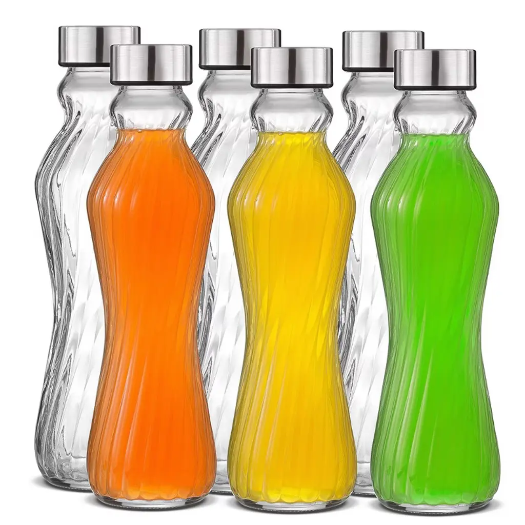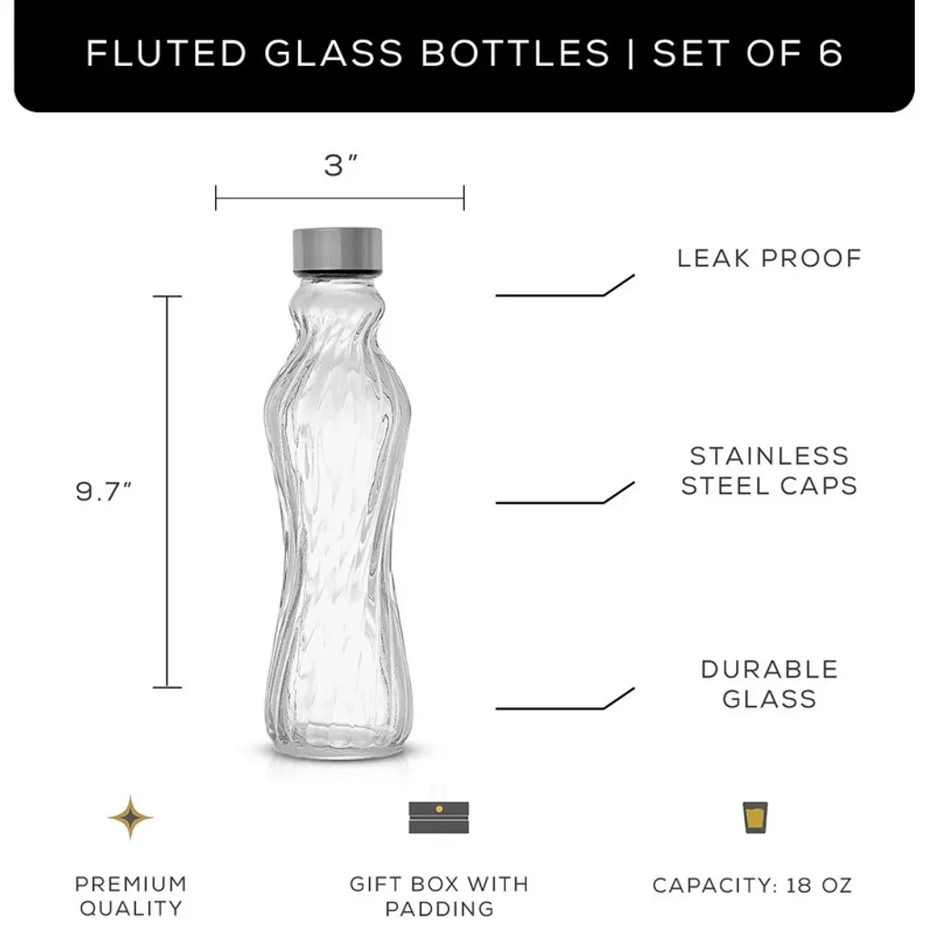 There’s nothing quite like that first sip of cold water when you’re thirsting for a drink. Elevate your water bottle routine with this set of 6 reusable and refillable glass water bottles that hold up to 18 ounces of your favorite beverage. Affordably priced considering the ergonomic and fluted design, the Spring glass bottles are the perfect choice for those looking to upgrade to glass water bottles without spending a small fortune. Each Spring fluted reusable water bottle is crafted from 100% real glass and built to last. Featuring a twist-on stainless steel cap that locks in liquid to prevent leaks and spills, the Spring collection is the perfect upgrade for those looking to ditch plastic water bottles and cut down on environmental waste. The Spring fluted bottles hold up to 16 oz of liquid each, and are suited for a variety of beverages including juices, coffee, sodas, cocktails, and more. Cleaning is a cinch, too, because you can sanitize the glass water bottles right in the dishwasher. CAUTION: Do not subject glassware to extreme or sudden temperature changes (either hot or cold) as doing so may cause the glass to break or shatter potentially resulting in bodily injury.