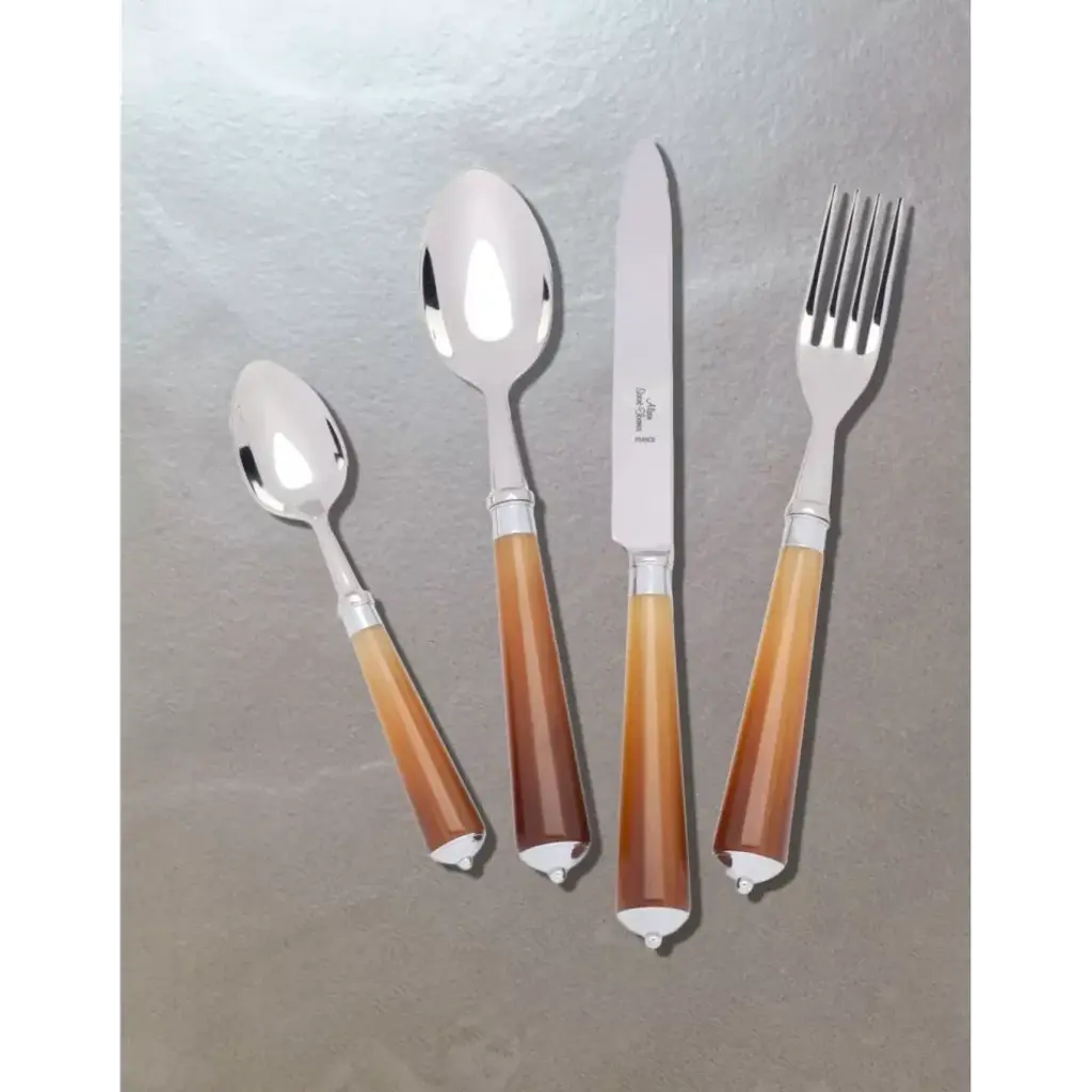 These items are made from a resin which looks like natural materials and may be variable in appearance. Alain Saint Joanis is a family-owned company that has been creating and manufacturing fine flatware in the purest tradition of French cutlery since 1876. These top-of-the-line collections are made with the finest quality silverplate and 18/10 stainless steel, with handles handcrafted from authentic, raw materials such as exotic woods, resins and enamels. All Alain Saint Joanis flatware is hand-assembled and hand-polished in France, and is dishwasher safe. Five-piece setting includes dinner knife, dinner fork, salad fork, soup spoon, and tea spoon.