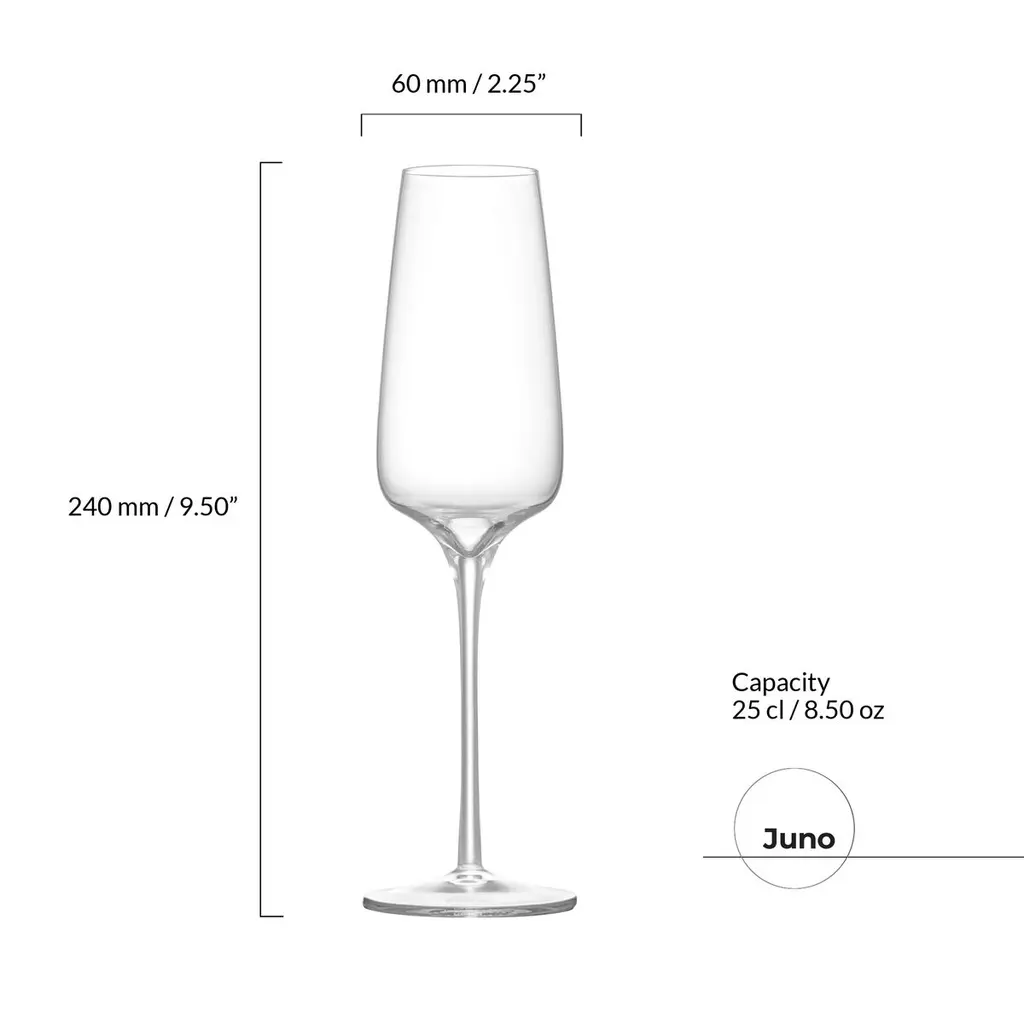 Celebrate in style with the Juno Champagne Flutes, featuring a sleek, tapered design that exudes elegance. Ideal for any occasion, these flutes make every toast unforgettable. Mouth blown and handmade by skilled craftsmen.