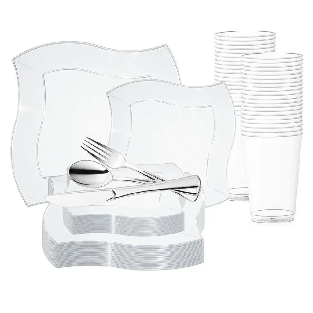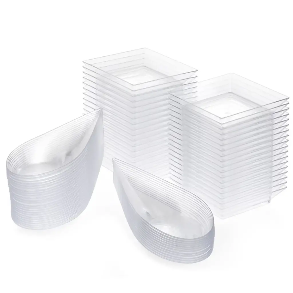 Add this clear serving set to your wedding reception supplies and create a photo-worthy dessert or appetizer spread. The clear plastic is sure to go with any wedding theme or event decor. The miniature size makes these tasting spoons and plates ideal for small treats, cake bites, and finger foods. This beautiful appetizer set comes with 36 square plates and 36 teardrop spoons, the perfect amount for an intimate gathering!